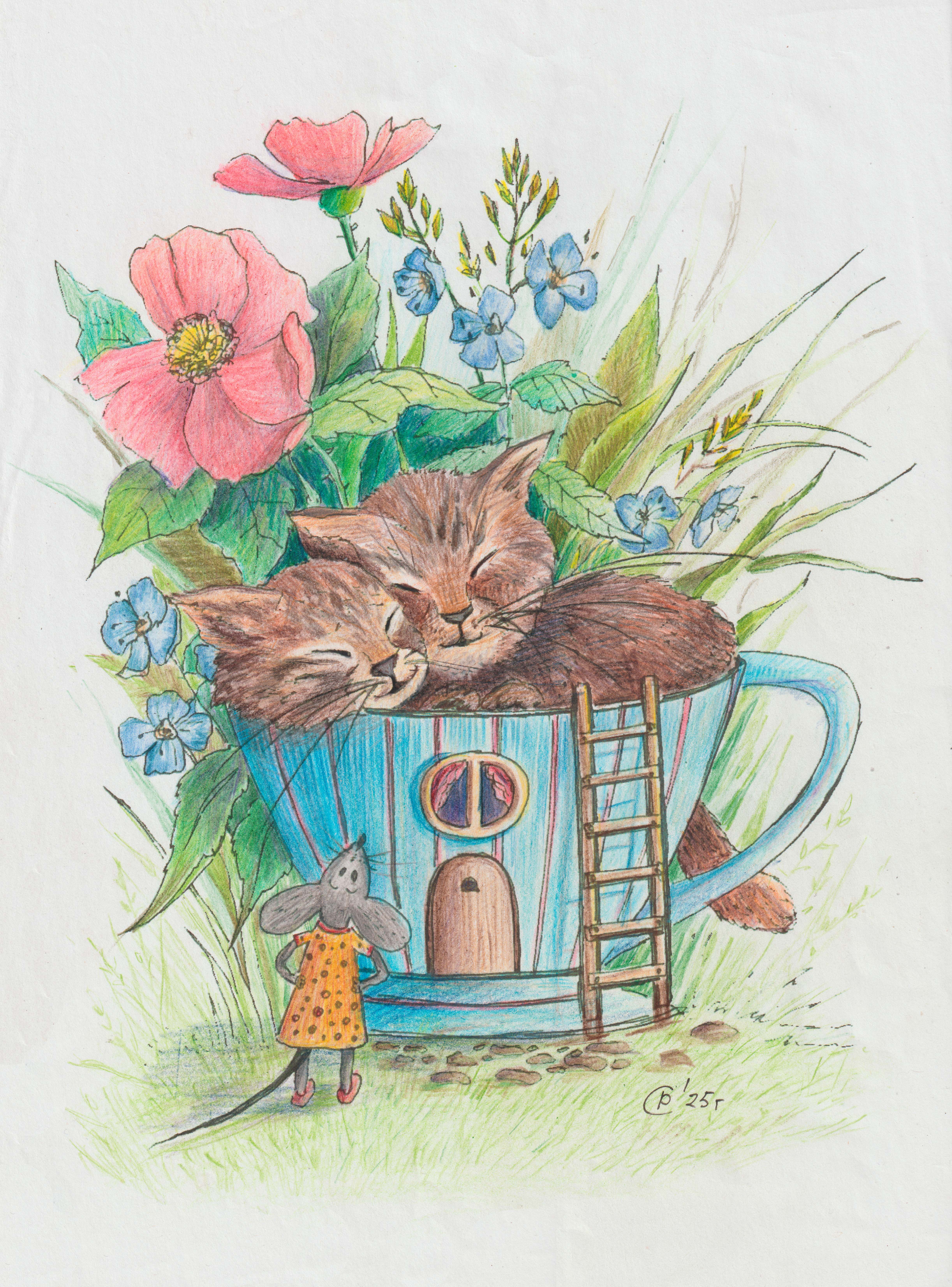 A cute illustration about the interaction between cats and mice. It can be used in book graphics or as a standalone postcard. It is made using colored pencils.