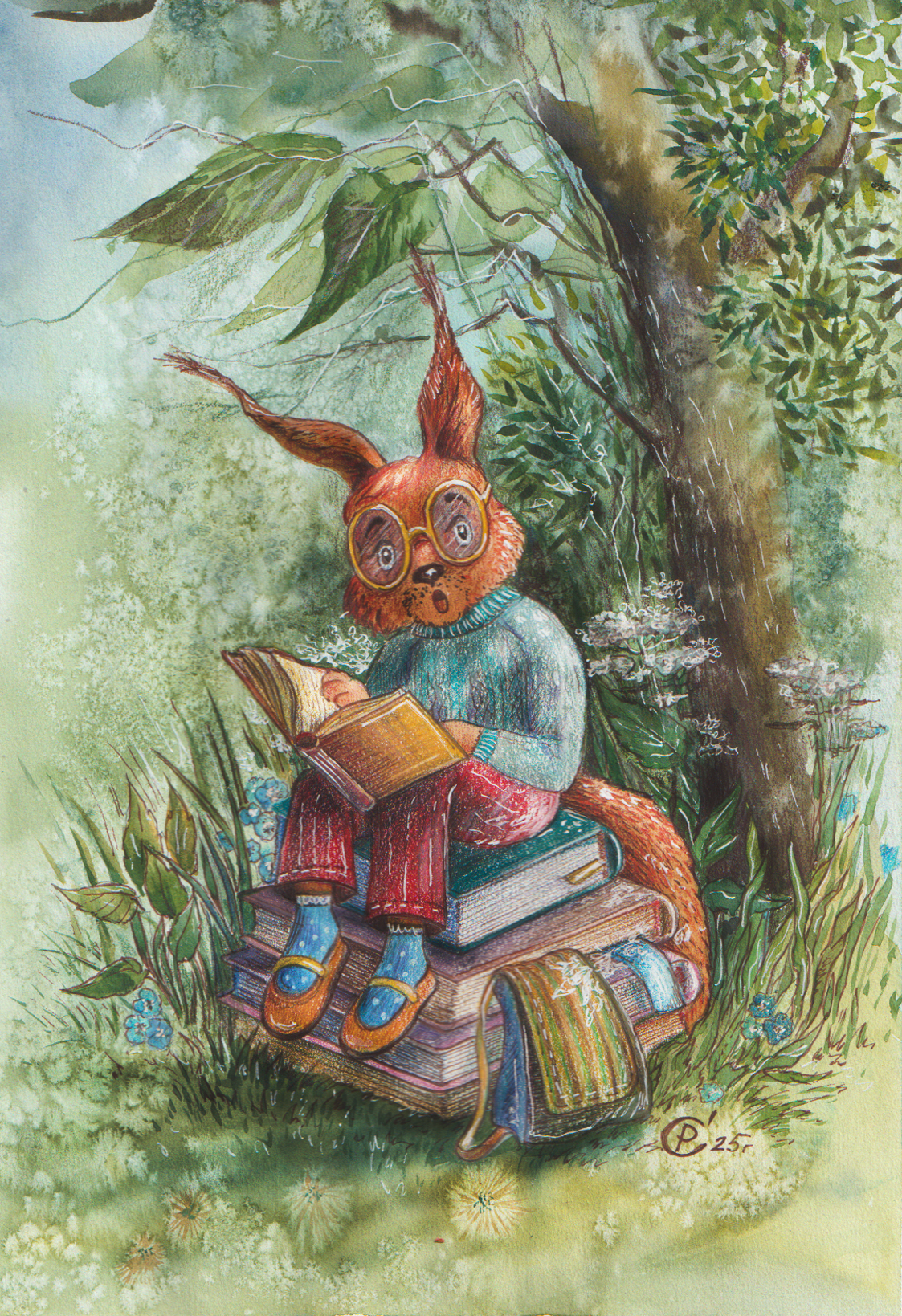 The illustration is made in a mixed technique. It can be used as a postcard, book illustration, or coloring page