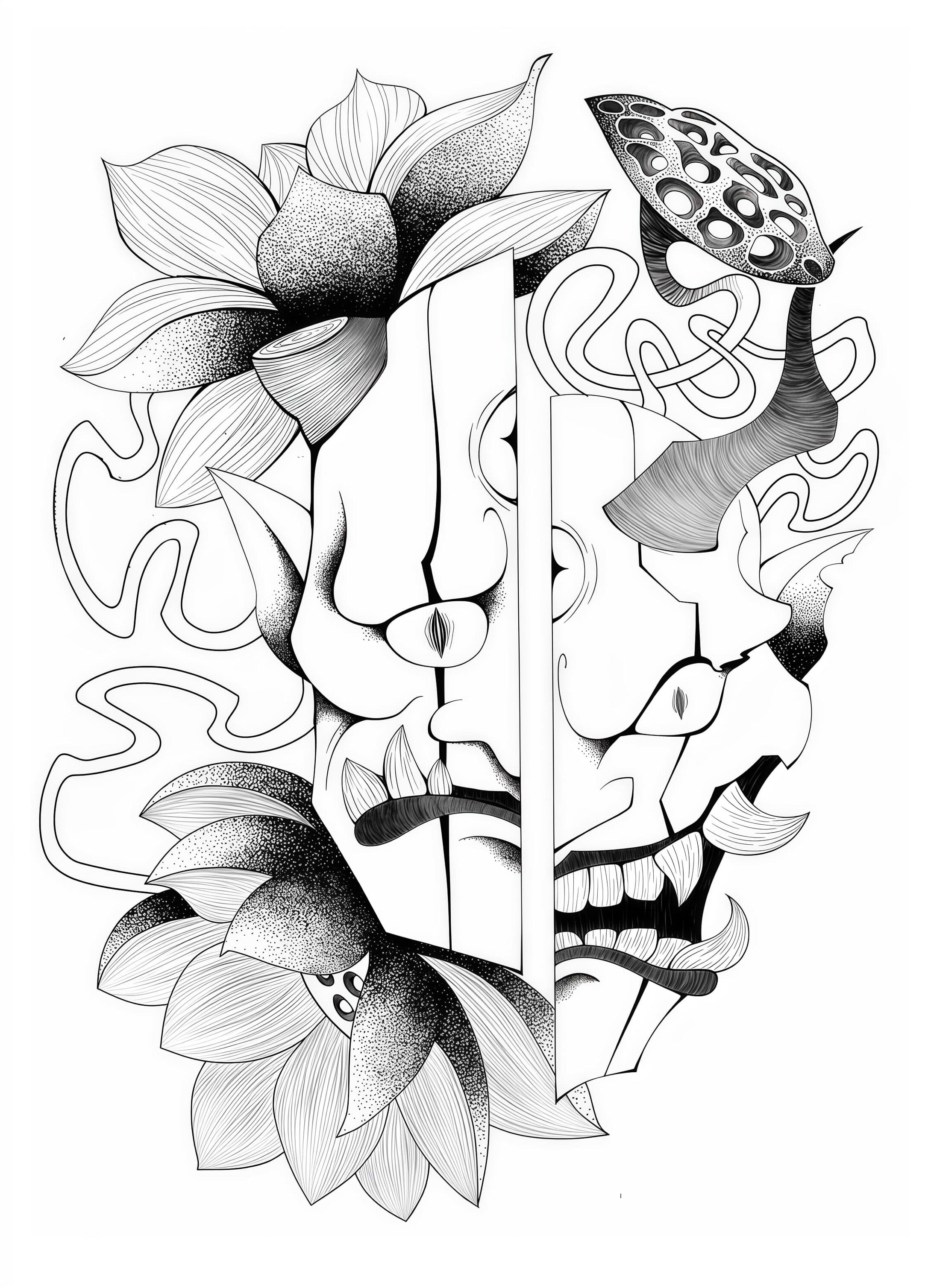 A stylized sketch of Japanese demon masks.