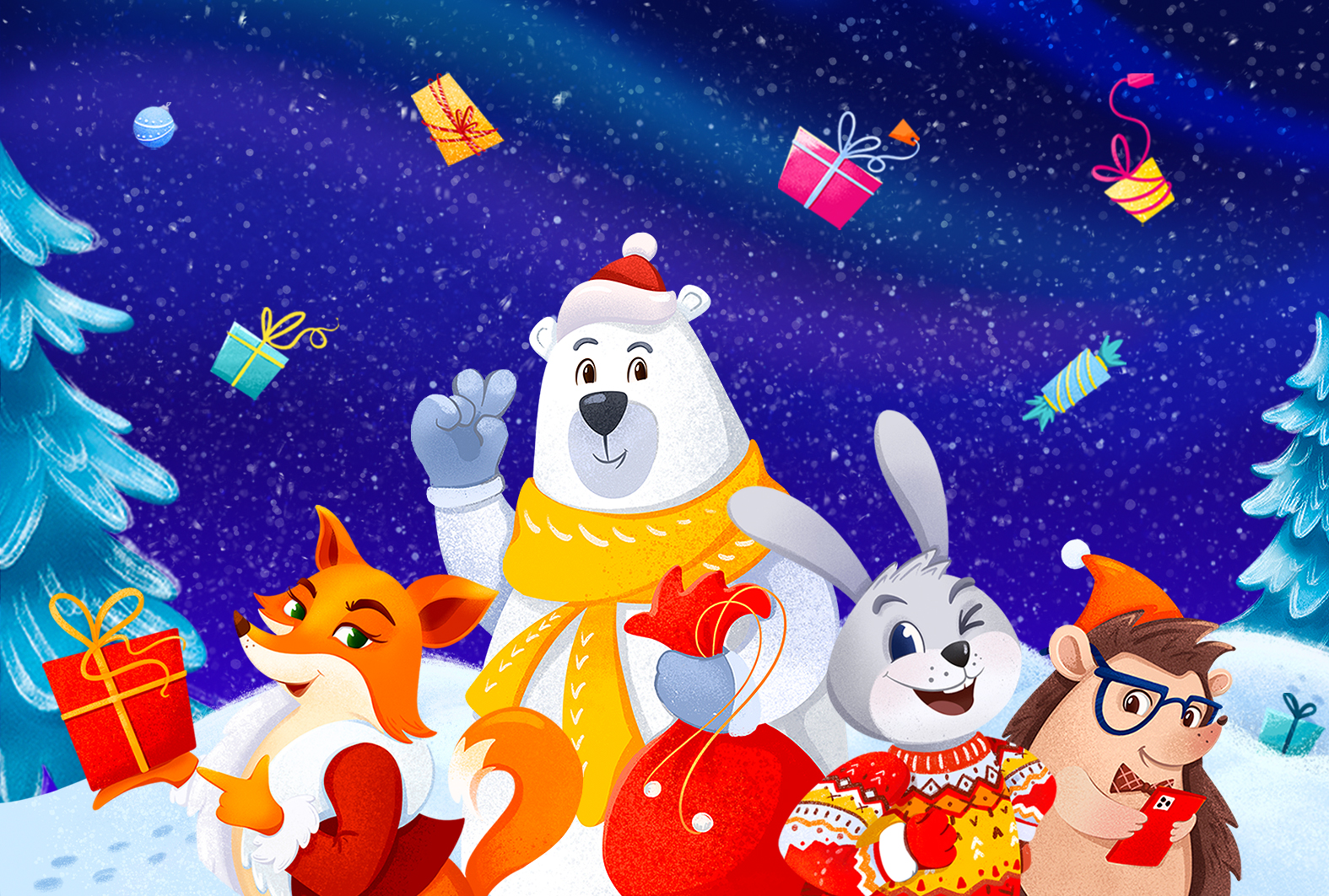 Персонажи разработаны для новогоднего оформления сети супермаркетов "Магнит". Это команда друзей, которые готовы помочь покупателям организовать новогодний праздник. Иллюстрации с персонажами использовались на баннерах, плакатах и полках магазинов.
