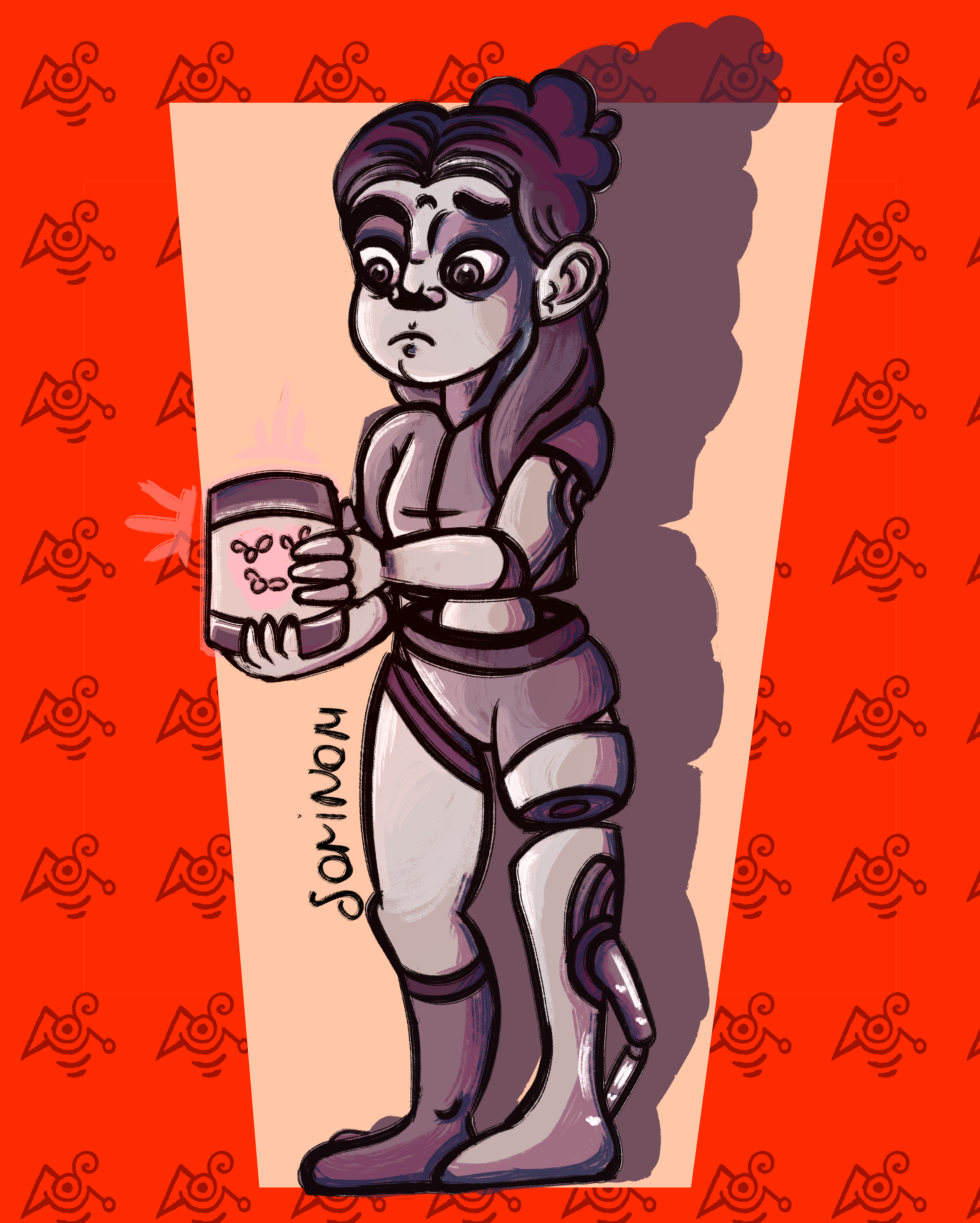 Mecha-girl holding a jar of fireflies in her hands.