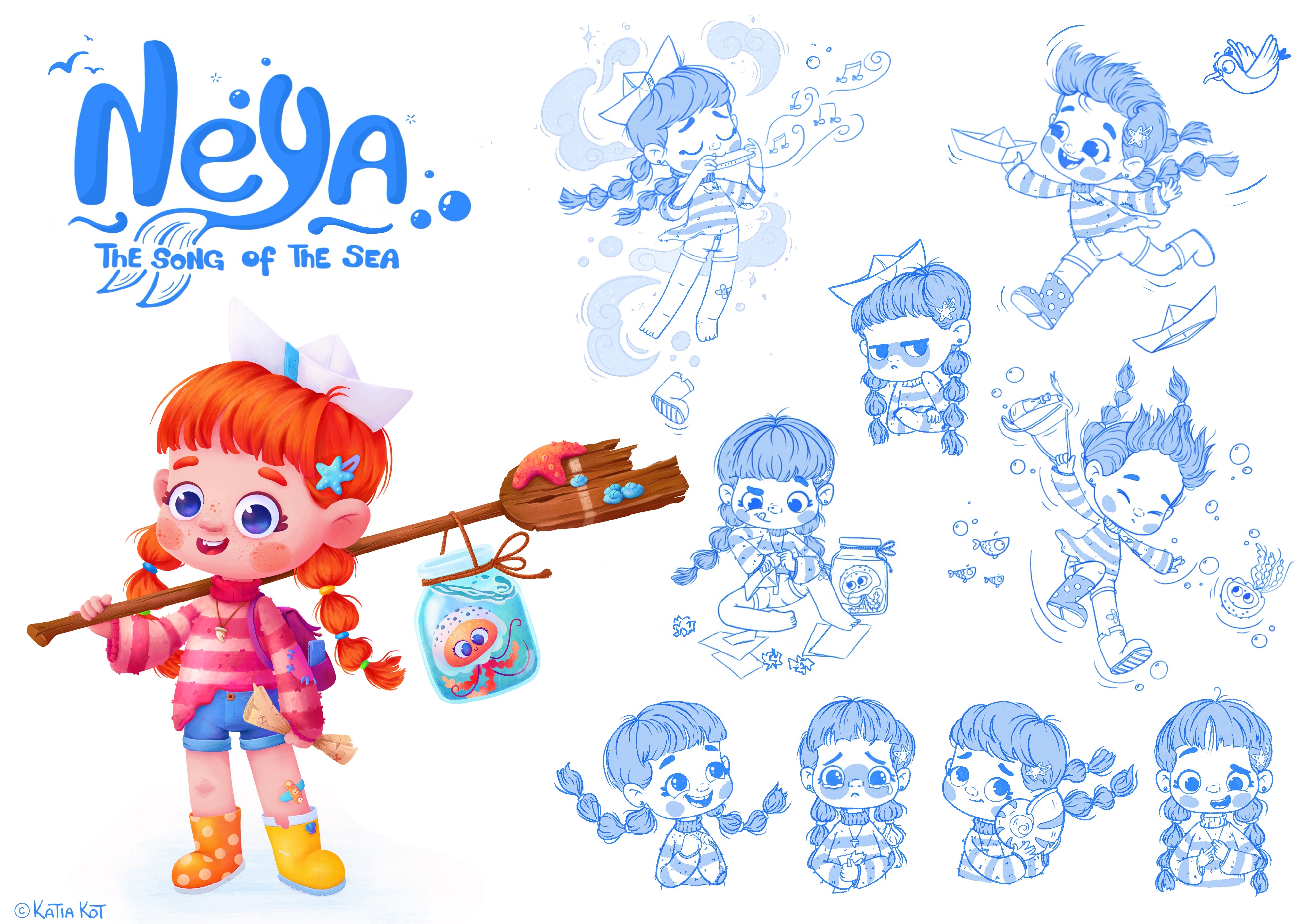 Neya is the main character of my original story “The Song of the Sea”, inspired by sea legends and adventures. This character sheet showcases Neya’s design, personality, emotions, and key story moments. The artwork is created digitally with bright colors, soft textures, and expressive character design.