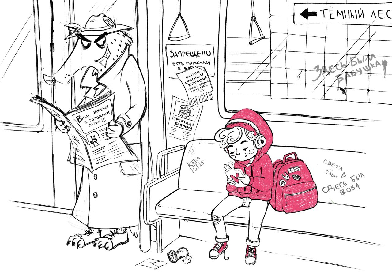 A modern interpretation of the classic “Little Red Riding Hood.” A girl in a red hoodie rides the subway, unaware of the suspicious wolf in a trench coat and hat. The illustration is done in a graphic style with storytelling details hidden in the environment — from posters and graffiti to character expressions.