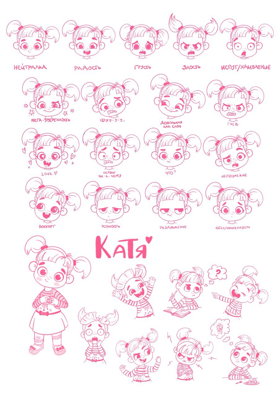 This sheet showcases the development of a character named Katya through a wide range of emotions and expressive poses. From joy and surprise to irritation and contemplation, each emotion is conveyed through clear facial expressions and body language. The illustration is done in a graphic style, focusing on character, dynamism, and expressiveness.