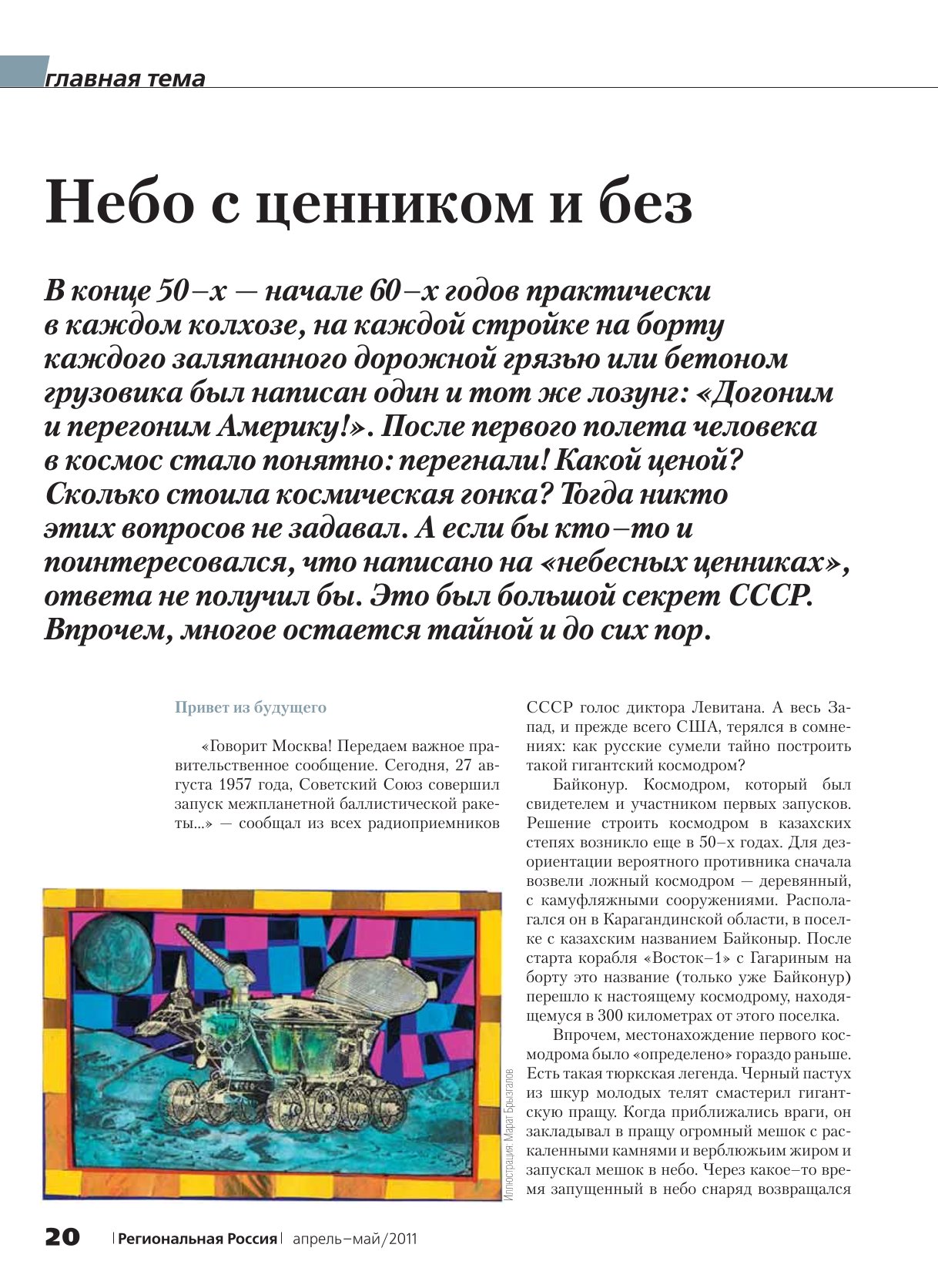 Illustration for the magazine "Regional Russia" April-May 2011. The theme of the issue is Cosmonautics Day. The illustration is a lunar rover. Technique: White cardboard for the base, gouache, ink, colored pencils, and colored paper. A series of illustrations for Cosmonautics Day.