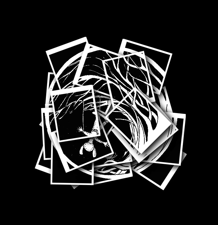 А stack of photos, illustrating the same living baby-doll hanging from the tree of the midnight. The text below this picture is the monologue of one of those mayflies.