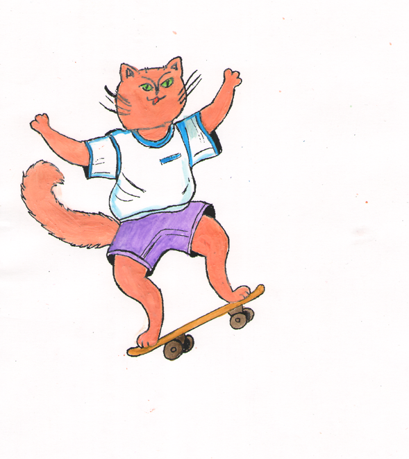 A ginger cat is riding a skateboard. The illustration style is decorative. The technique used is paper, ink, acrylic, and gouache. Artist: Marat Bryzgalov.