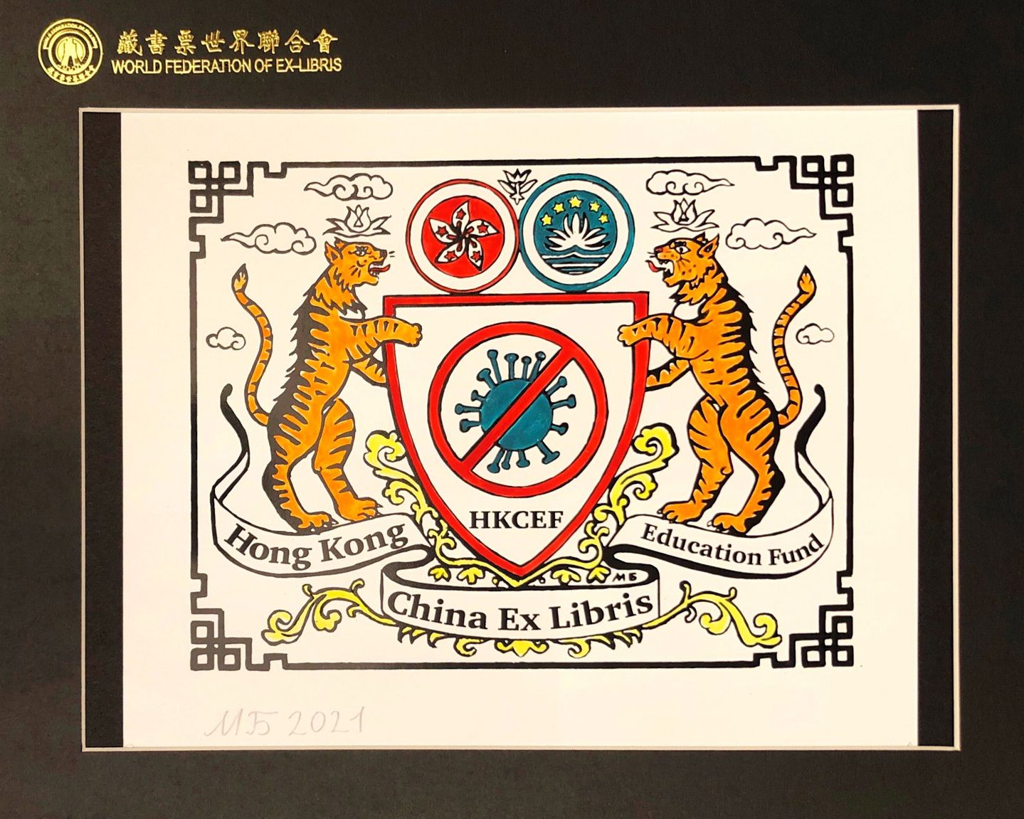 The ex libris was created in 2021. For an international exhibition and competition in Hong Kong, China. The ex libris was one of the winners. The ex libris was printed in a catalog. Printed graphics, S1 silkscreen. Signed by the author, 10 copies. Painted. Theme: Year of the Tiger. Fighting Covid-19."