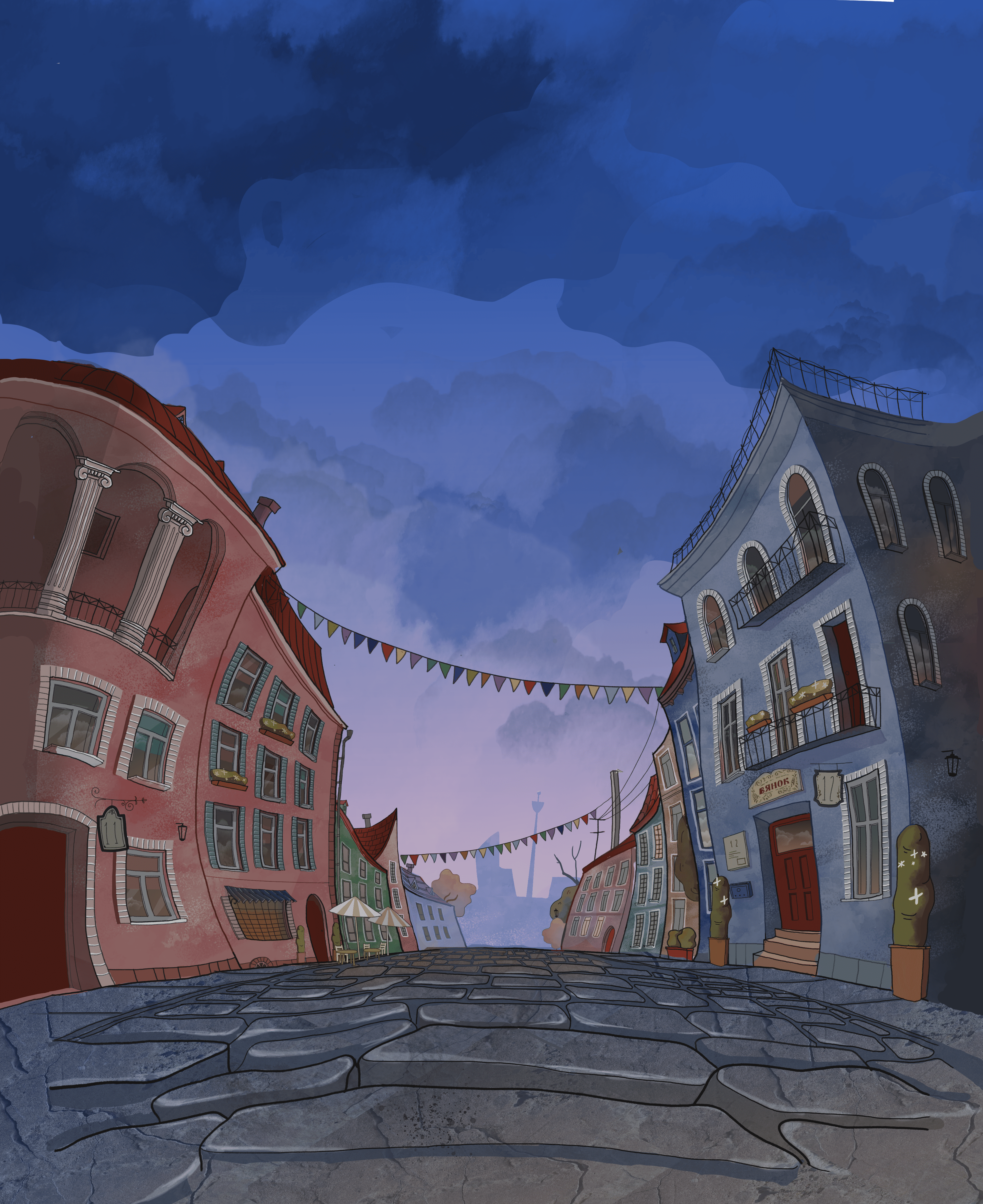 Тихий вечерний город, цветные дома