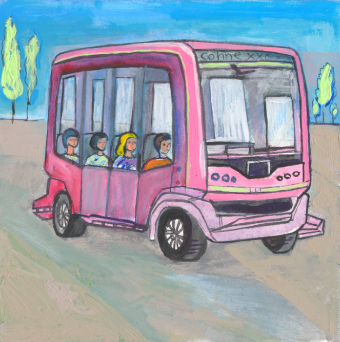For the magazine "Why?" Section "From Around the World". Published by the magazine "Young Technician". Published in the magazine. Illustration for printing in a reduced format: China. A new driverless bus is controlled by an artificial intelligence computer program.