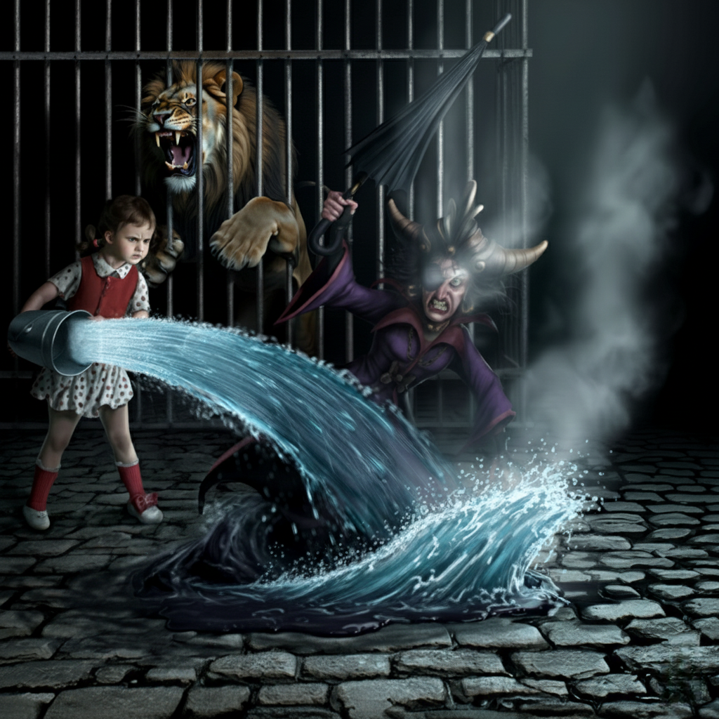 An illustration for the fairy tale The Wizard of the Emerald City - the scene where Ellie splashes water on Bastinda and she melts