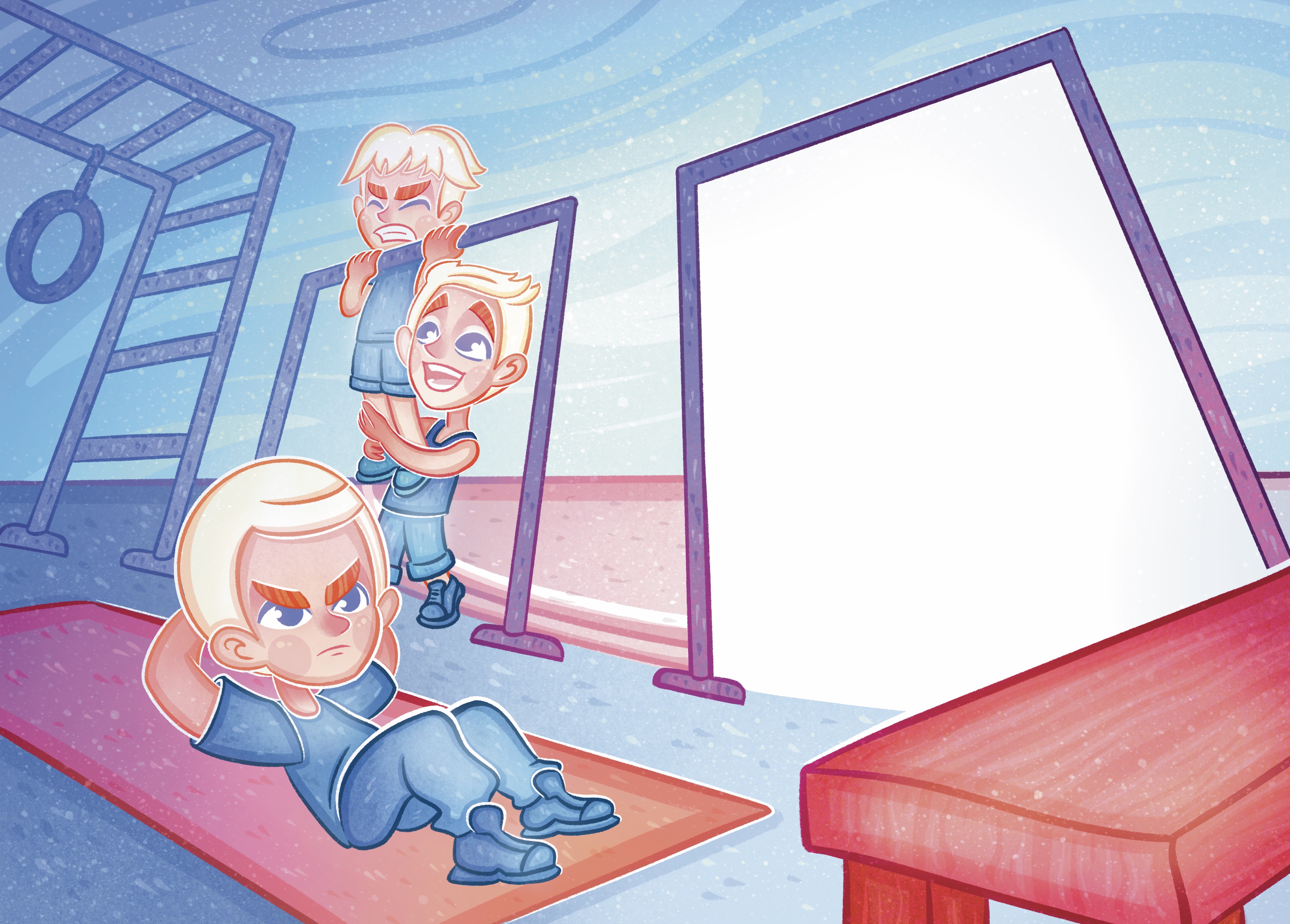 Three brothers playing sports. A spread for a children's book.