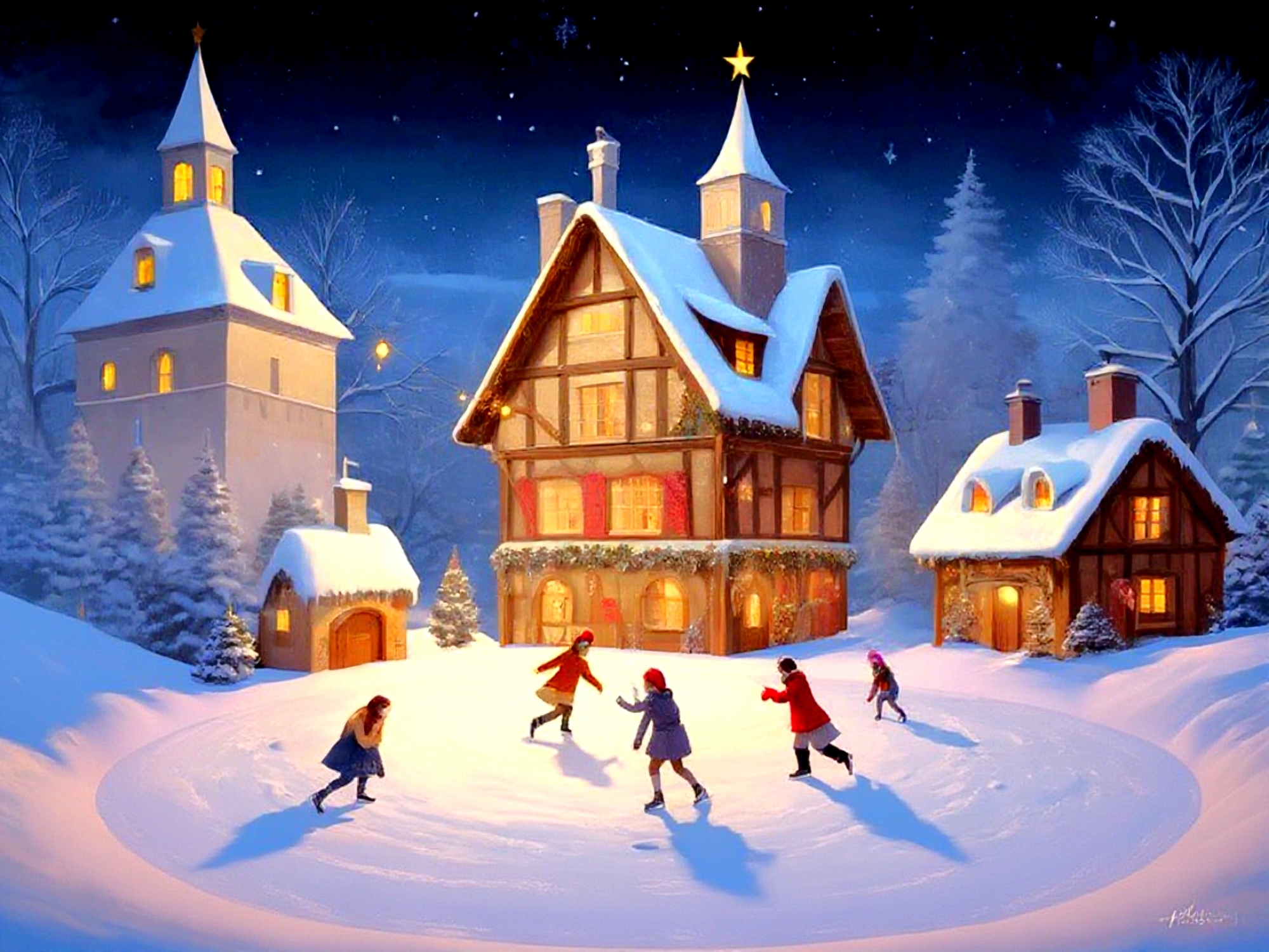 Дети катаются на коньках в заснеженном городке