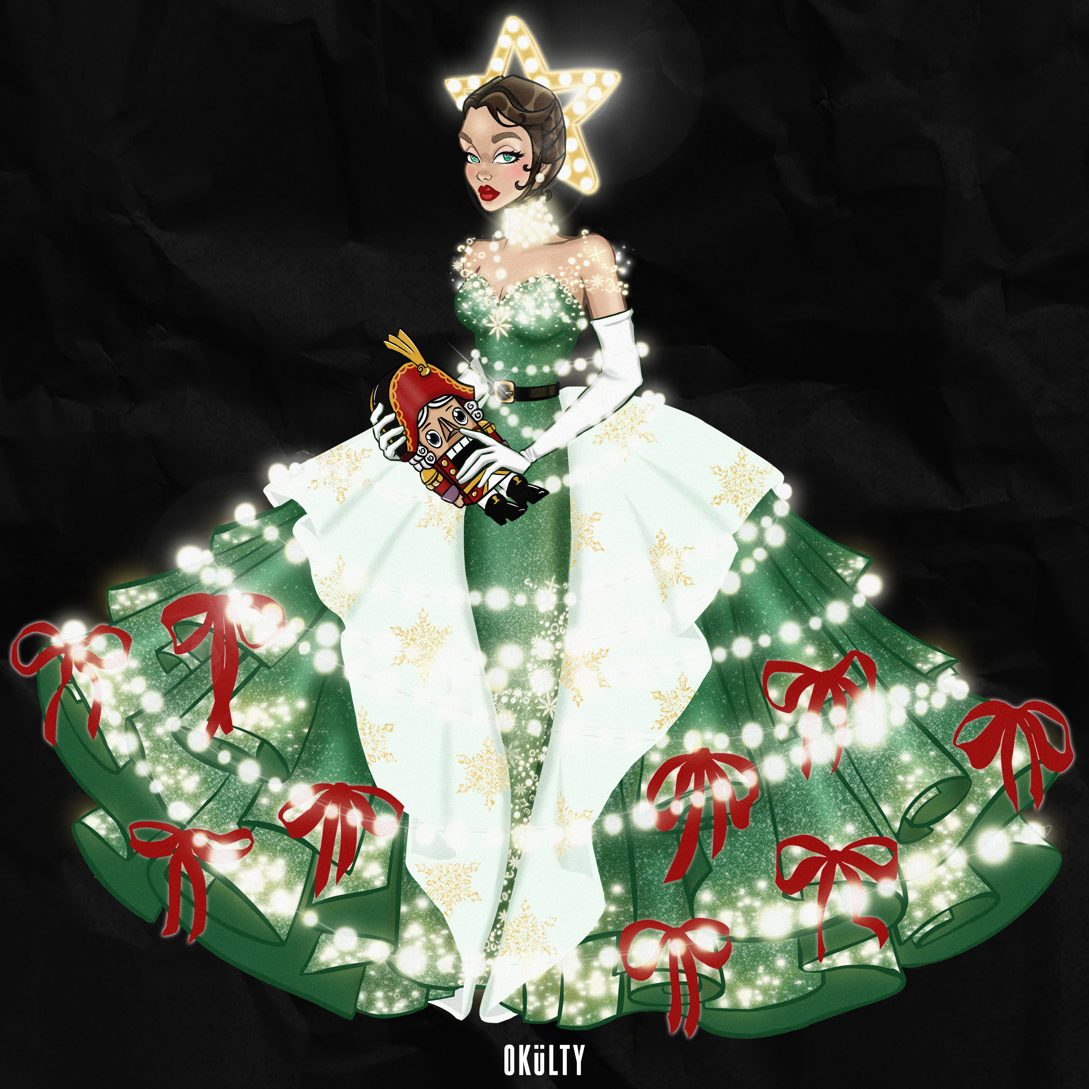 New Year and Christmas illustration in winter style: a girl in a festive dress in the shape of a Christmas tree, decorated with lights, gold and red ribbons, snowflakes, and decorative elements. The atmosphere of winter magic, coziness, and festive mood conveys the spirit of Christmas and New Year.