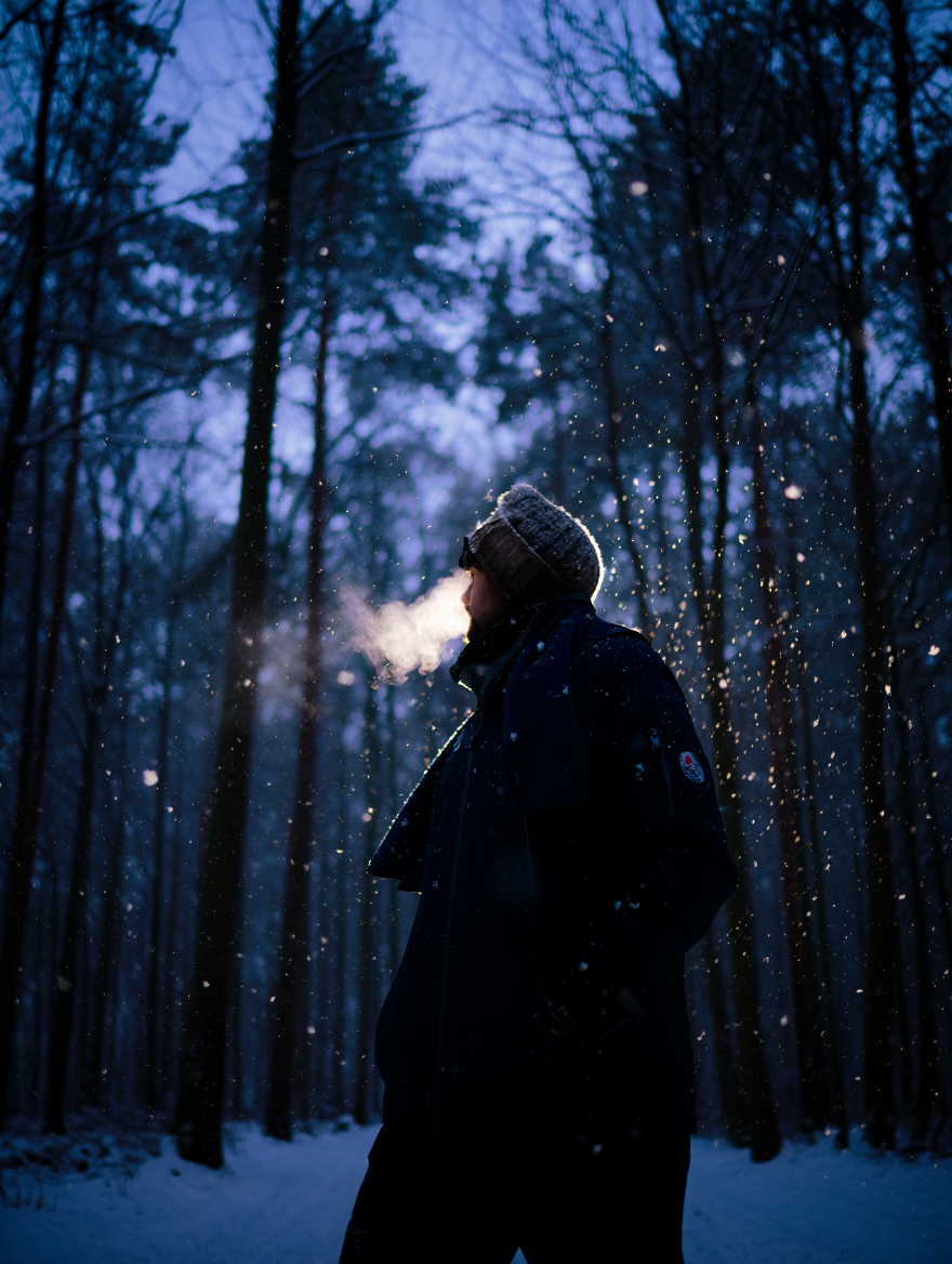 a man's winter breath in the evening forest