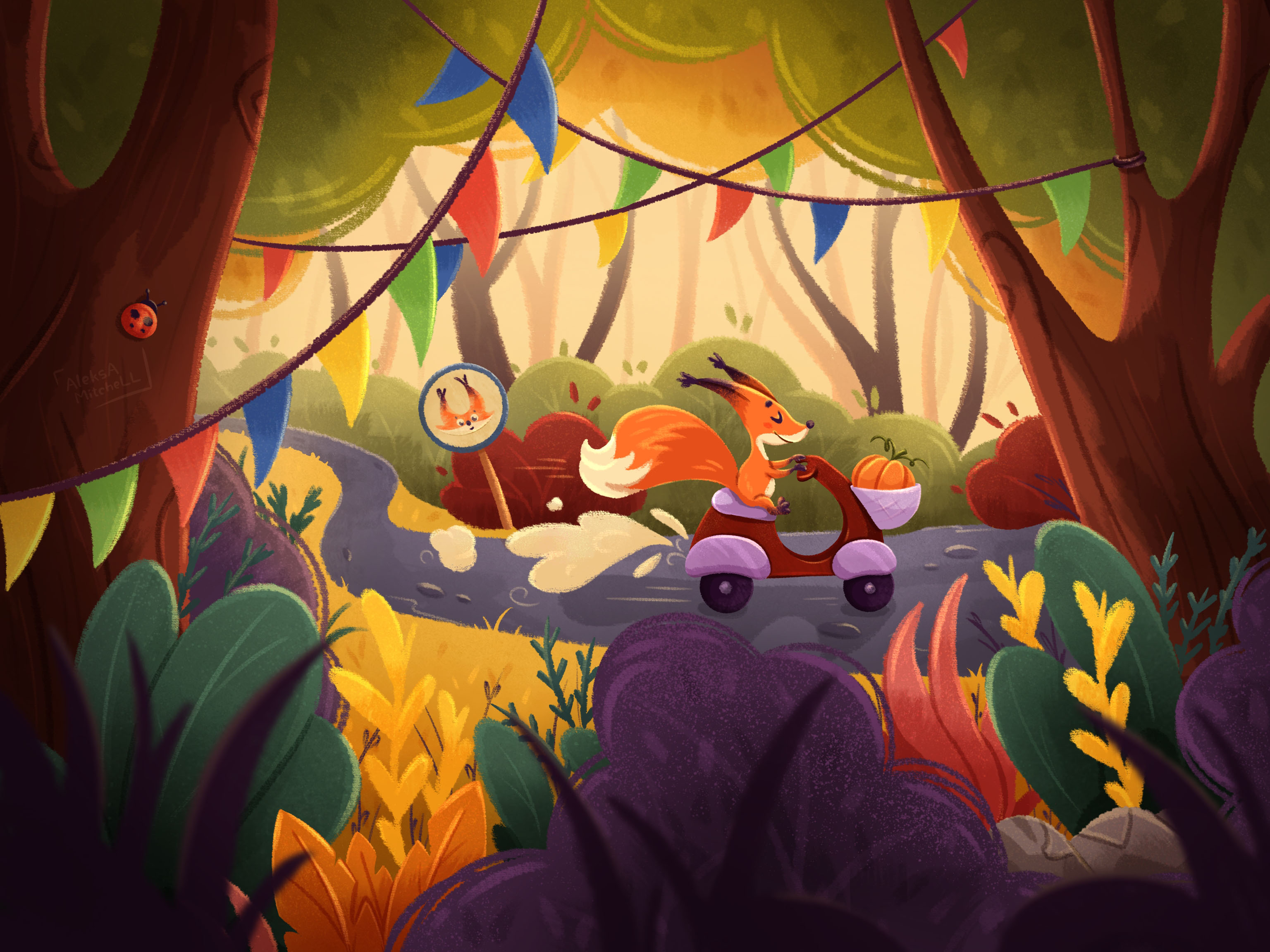 Иллюстрация для открытки с белочкой на мопеде в осеннем лесу