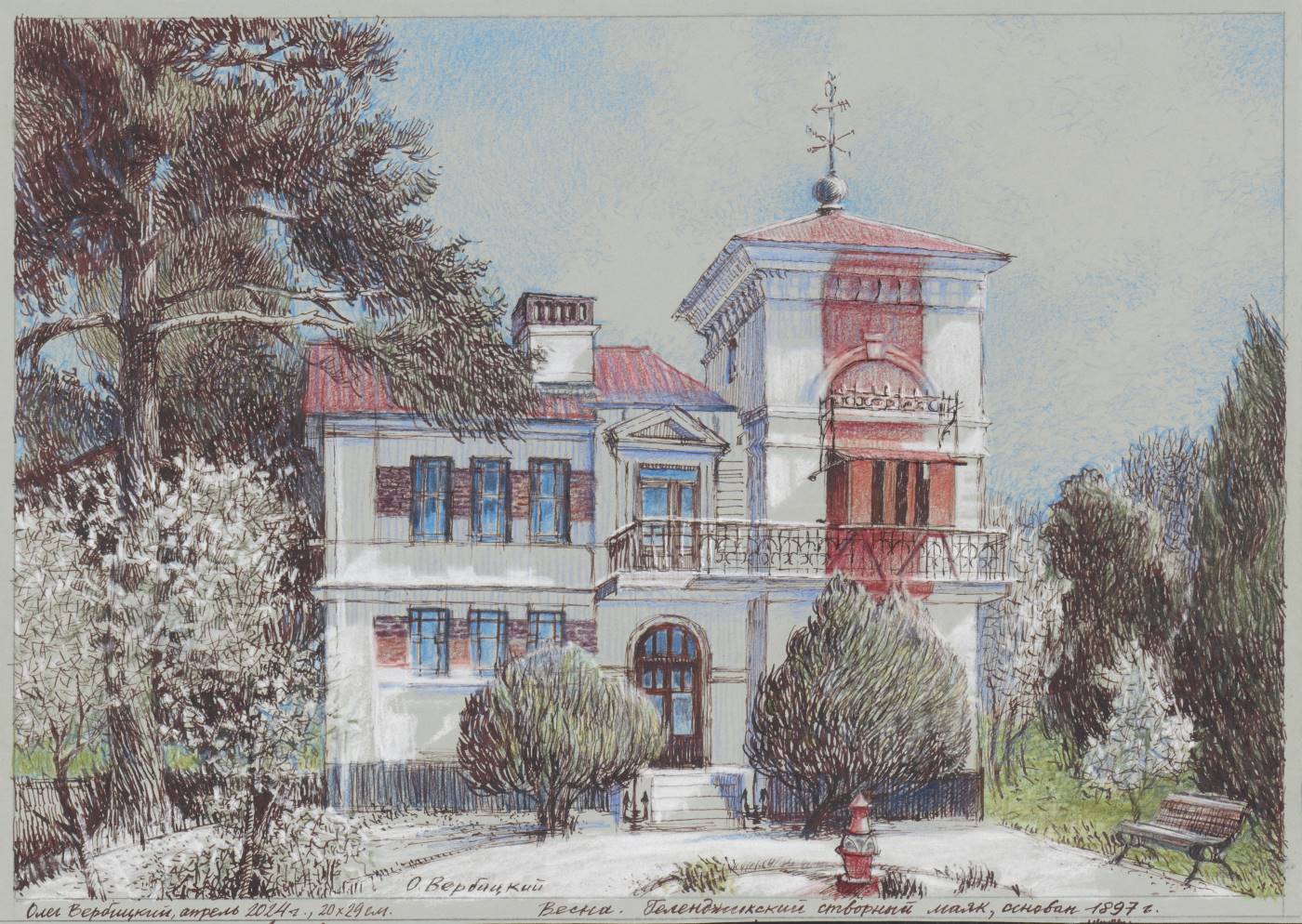Весна в Геленджике бывает пронзительной, с выразительным синим морем и белым цветом в камнях и домах. Но если смотреть от моря в сторону гор, синего почти нет. На фоне белого идет танец зеленых и красных цветов. В этих цветах я передал пейзаж со старым маяком. Меня он восхищает с детства, когда на вечерней прогулке, в сумерках, среди сосен я видел красивый дом светящий уютным зеленым или красным фонарем (смотря с какой стороны подходить) меня переполняла радость.