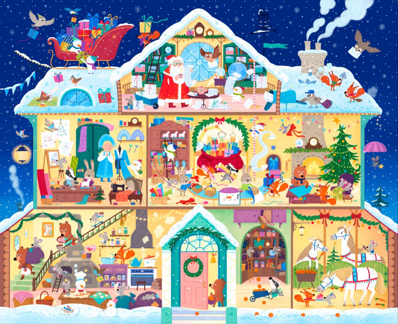 Классная работа, столько деталей! Мышка с парашютом и голуби в сугробе забавные)