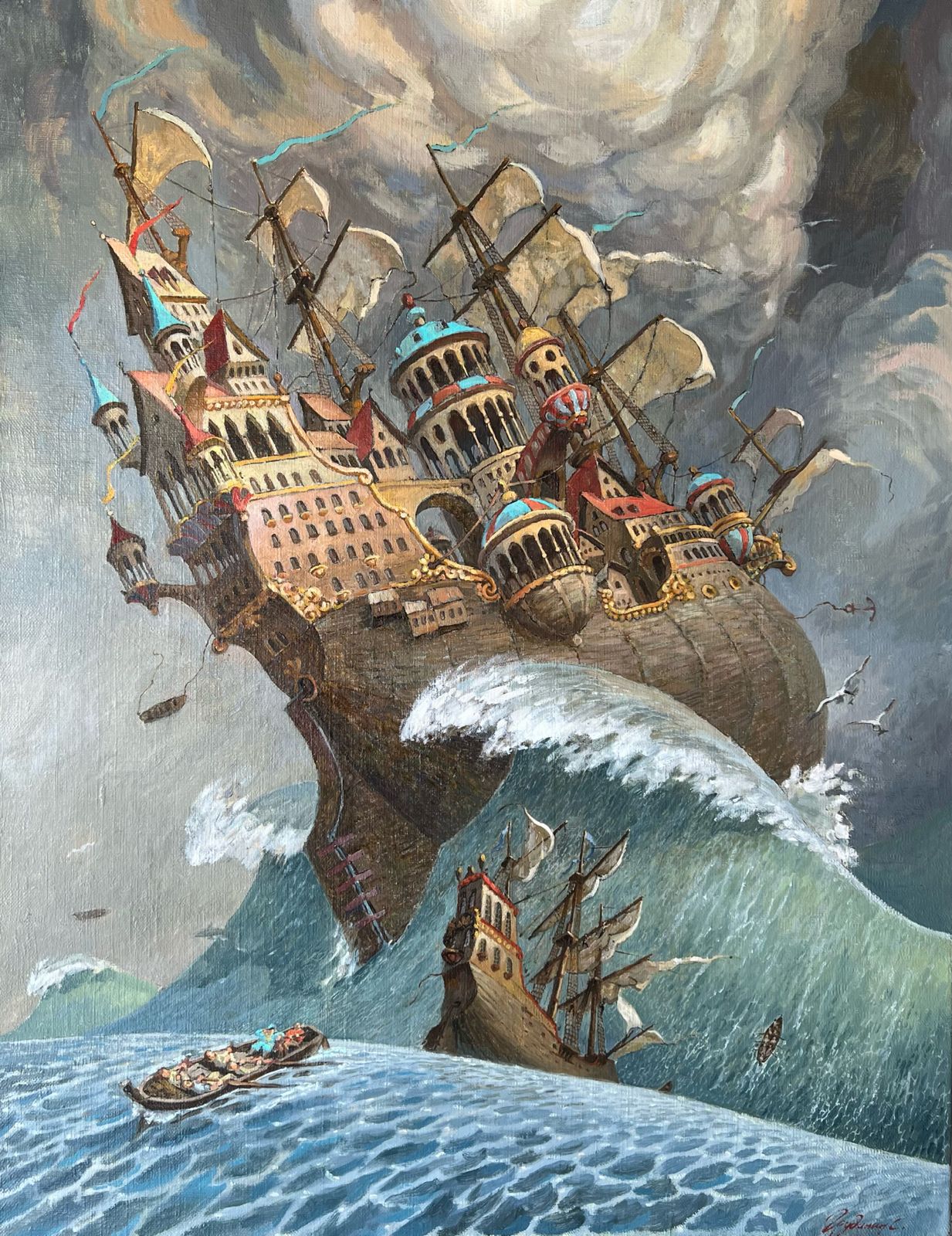 огромное парусное судно преодолевает шторм.