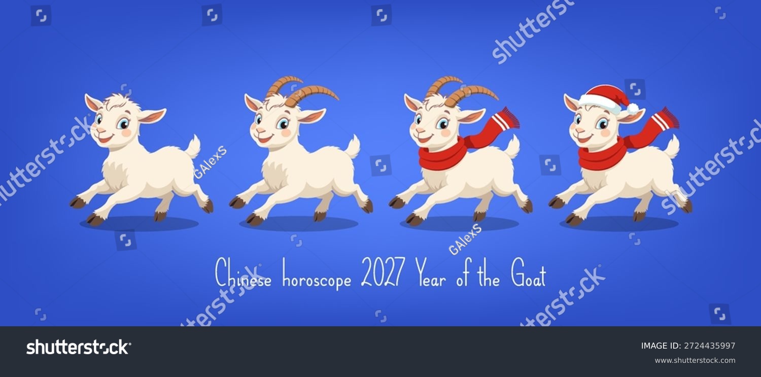 Vector holiday banner or card. 2027. Set of cartoon cute fairytale cuddly little running goats in Santa hat and scarf. Chinese symbol of new year. Xmas toon pet. Blue background
