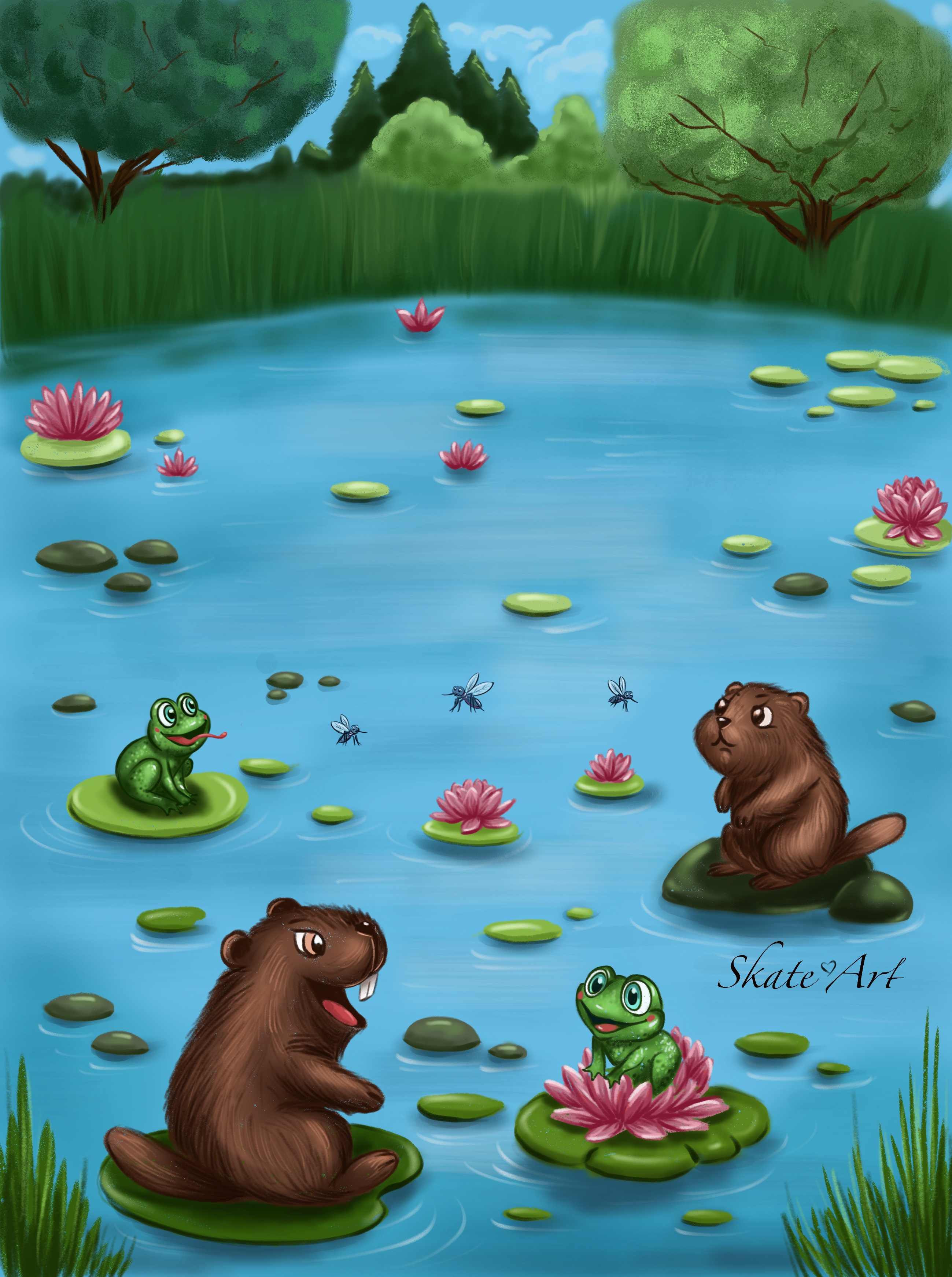 An illustration for the magazine "Yakster Tyashtenya," based on the author's story about a beaver and frogs. Digital art, Procreate.
