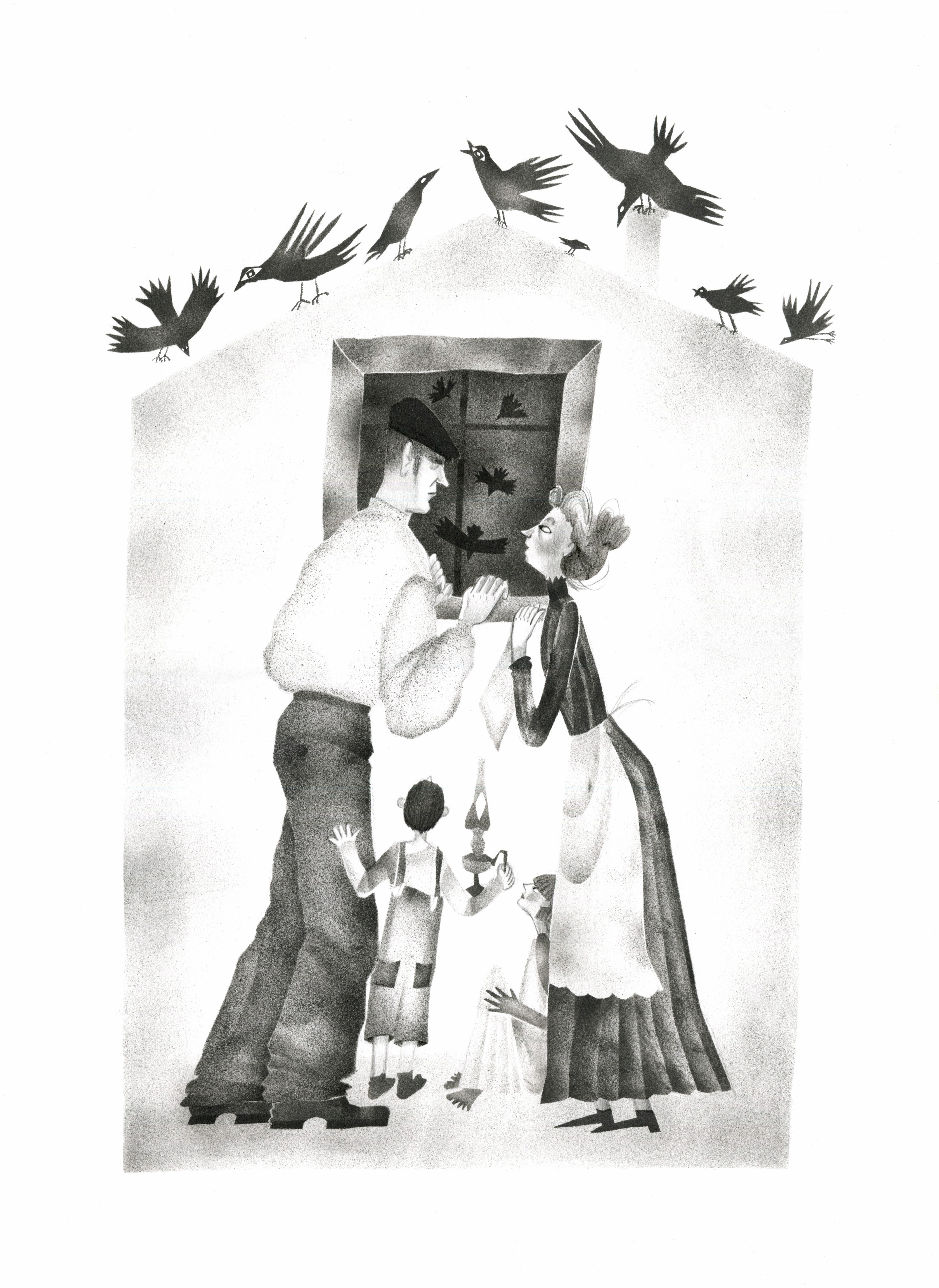Иллюстрации к рассказу Дафны Дюморье «Птицы». Рассказ относится к жанру ужасов. Иллюстрации выполнены в технике трафарет.