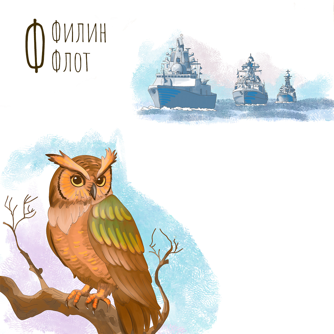 Буква Ф - Филин, Флот. Иллюстрация для издательства Русское слово