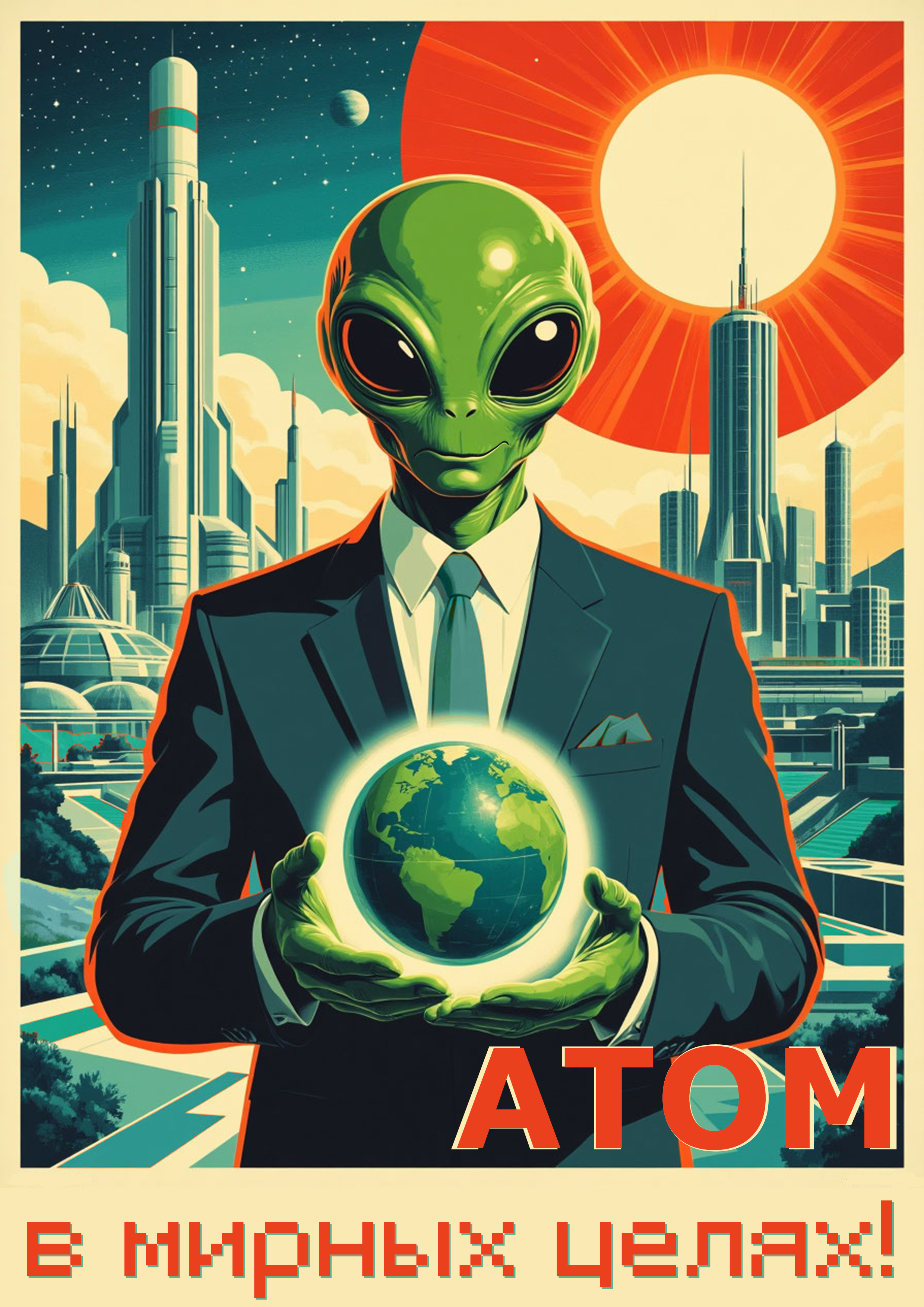 Когда советская агитация встречает межзвёздную дипломатию. Инопланетный специалист представляет новую мирную программу использования атомной энергии для развития цивилизаций. Назад в будущее, с плакатом!