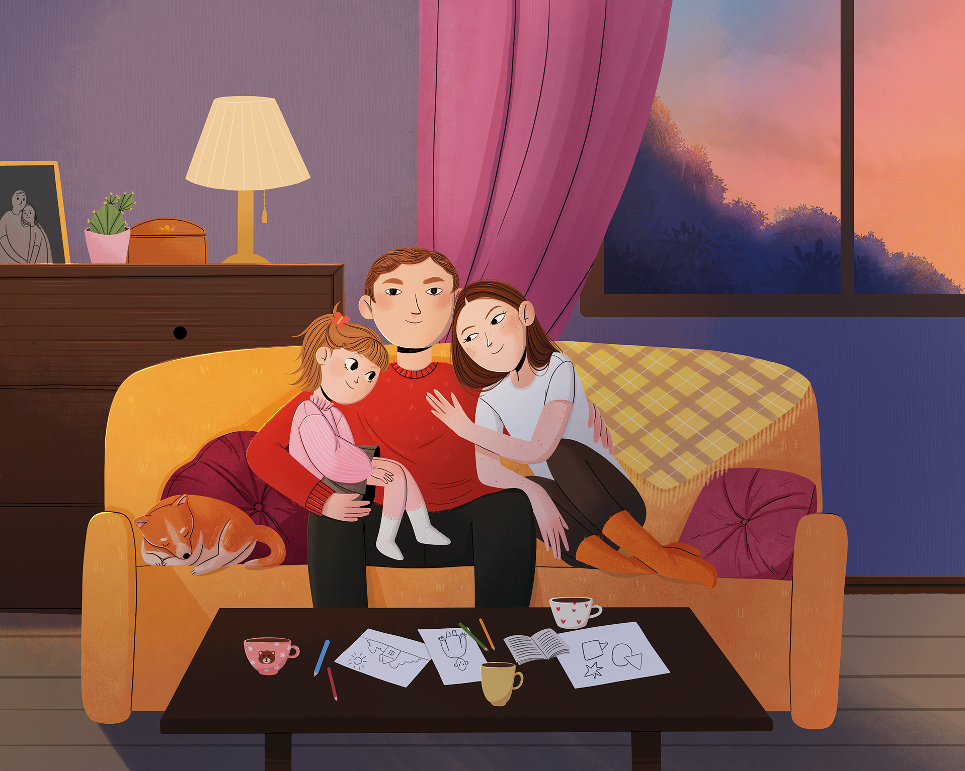 Тёплая семейная сцена: родители с дочкой уютно устроились на диване в закатных лучах. Атмосфера домашнего уюта: мягкий плед, лампа, чашка чая, детские рисунки на столике. Рядом мирно спит собака — идеальный штрих к картине семейного счастья. Иллюстрация передаёт ценность простых моментов: время, проведённое вместе, искренние улыбки и тепло родного дома. Идеально для вдохновения на создание семейных традиций и уютных вечеров!