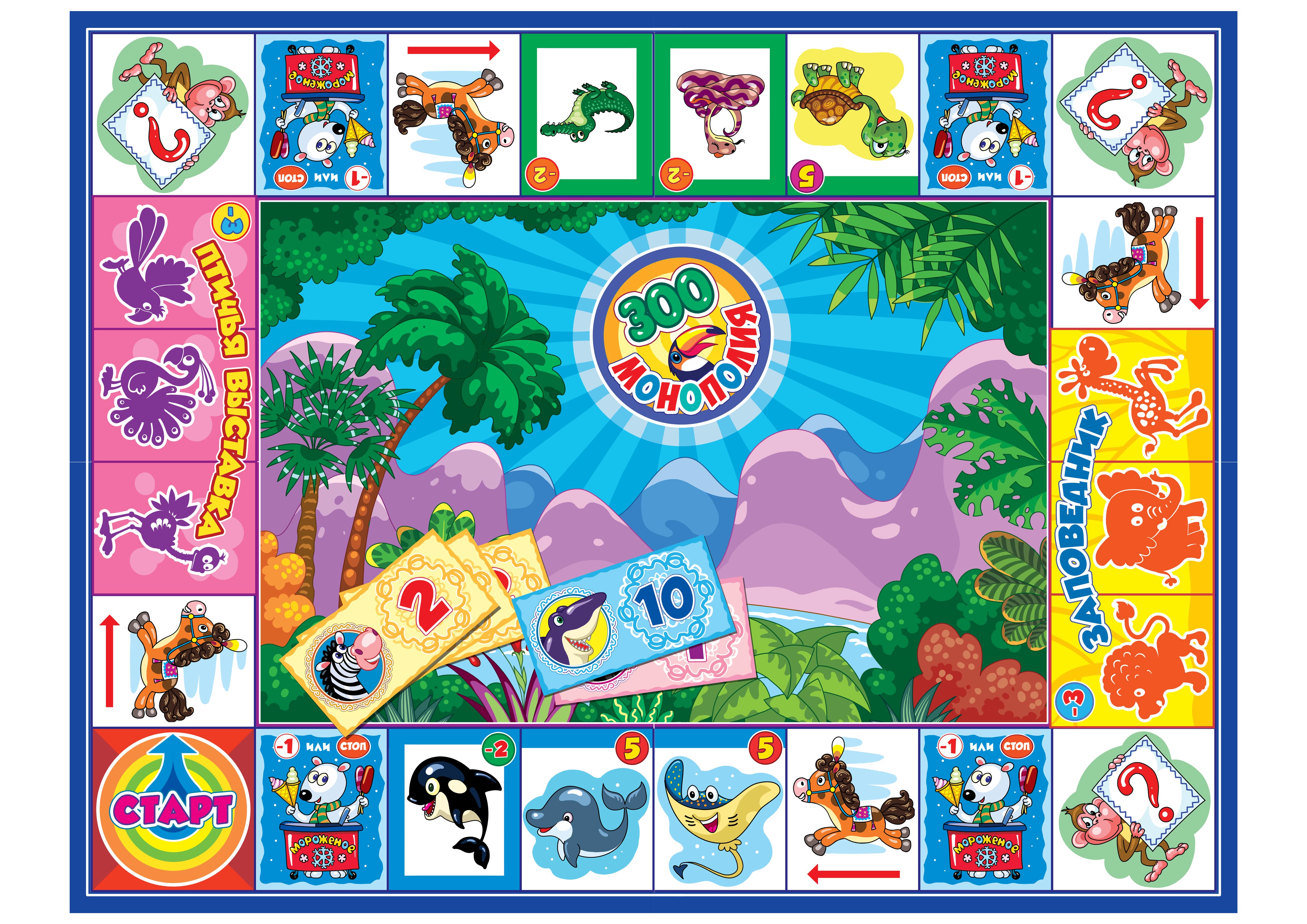 Это интересная настольная веселая игра для всей семьи по типу классической Монополии. Сбалансирована, можно играть вчетвером. Учит не только основам экономики, но и любви к животным. Могу разработать и нарисовать подобную игру на любую тему: динозавры, насекомые, сказки, география. Играй и познавай мир. Стоимость от 10 тыс. Зависит от сложности и качества. От мультяшного стиля до живописного гиперреализма. Договоримся.