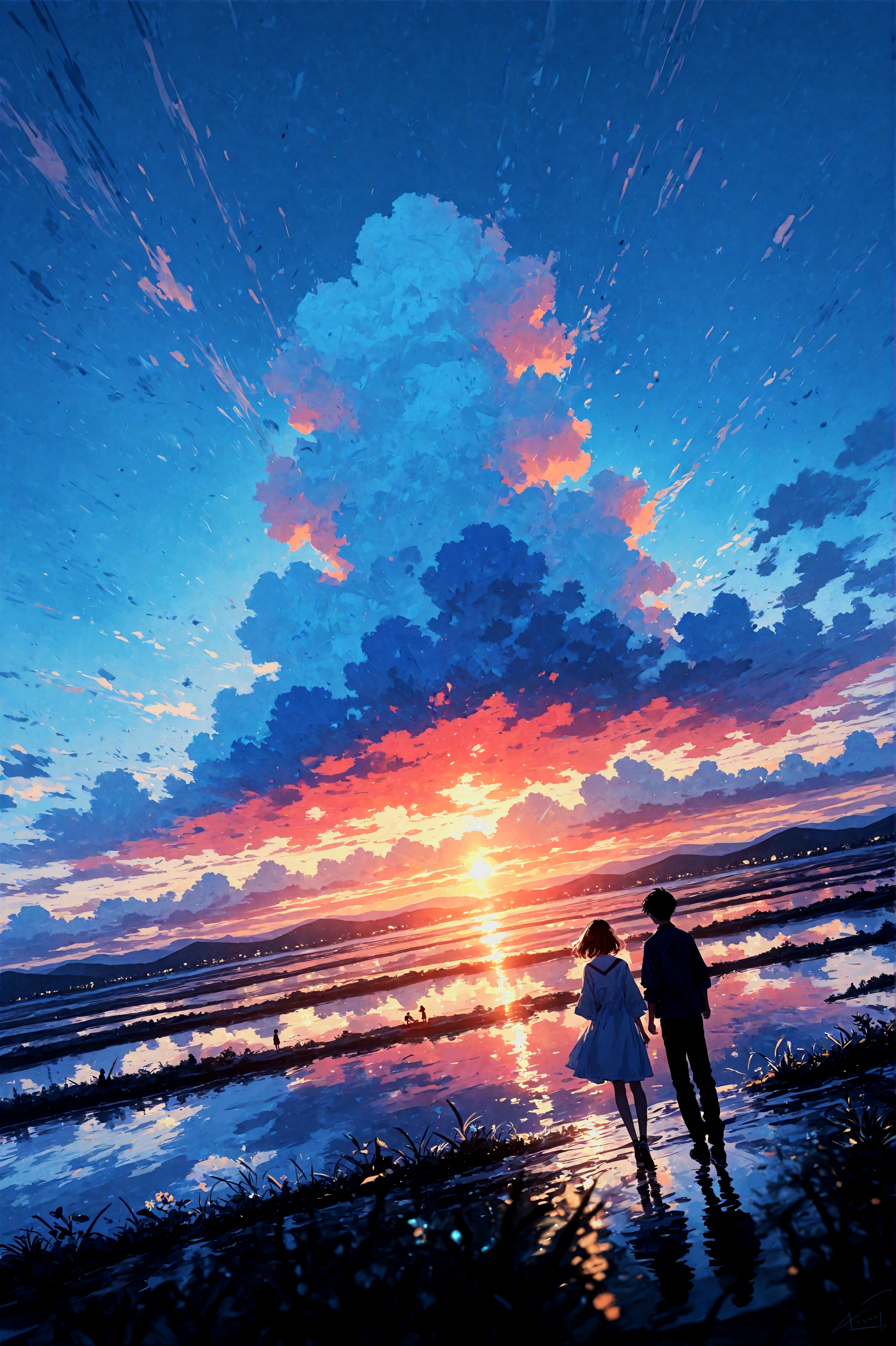 Спокойный закат над водой. Рисовое поле. Пейзаж написан мной лично, с применением AI исключительно для дополнительного рендера и апскейла.