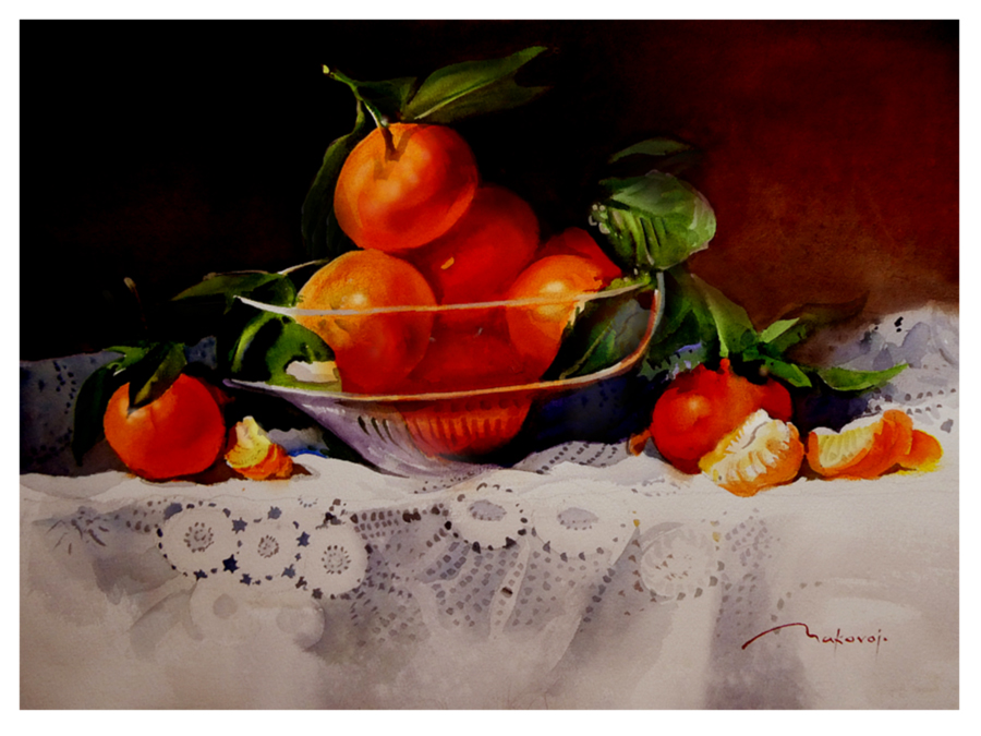 Натюрморт с мандаринами на занятии в студии.Акварель,учебная демо-версия,бумага Baohong,300 гр.38*54 см.2026 г.