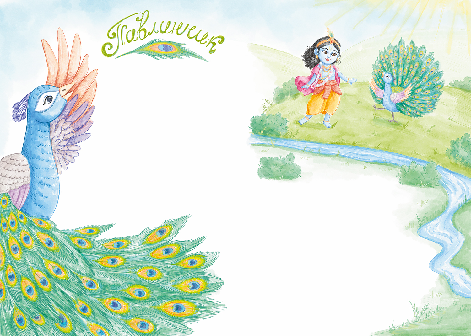 Разворот для детской книжки. Иллюстрация к детской песенке о павлинчике, который хочет потанцевать с Кришной.
