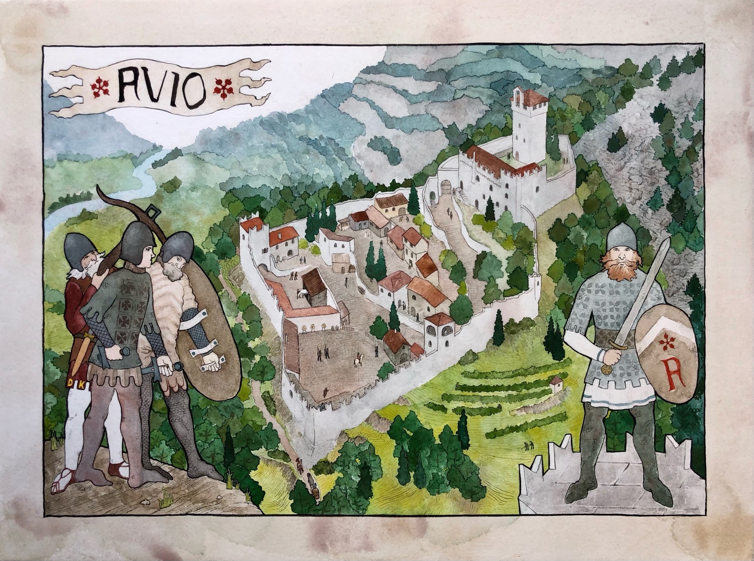 На этой картинке - попытка представить себе замок Авио, таким как он был в дни своей юности. На передний план непременно захотелось вынести героев фресок из главной залы, сохранившихся до нашего времени.