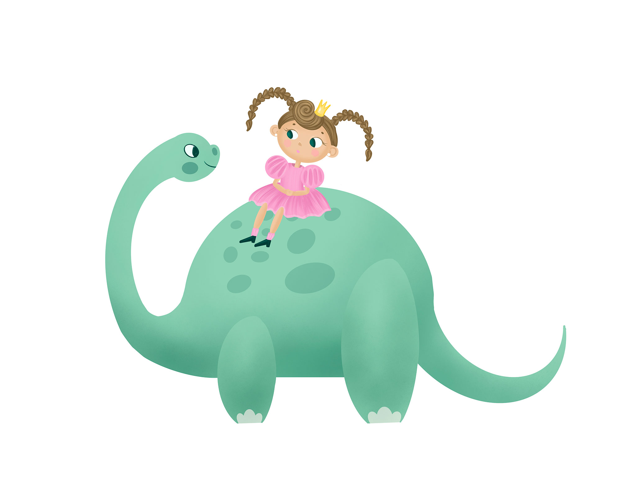 Children’s illustration featuring a little princess riding a friendly dinosaur in a soft cartoon style. Gentle pastel colors, cute characters, and a clean composition make it perfect for children’s books, websites, greeting cards, room decor, and educational projects. Suitable for print and digital use. Original digital artwork created for brands, creative products, and kids-focused design projects.