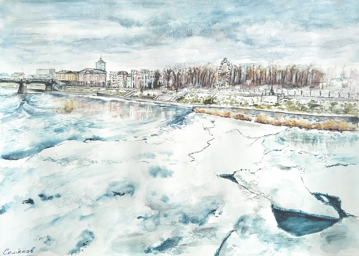 Вид на городской сад с моста. Рисунок акварелью 30х41,5