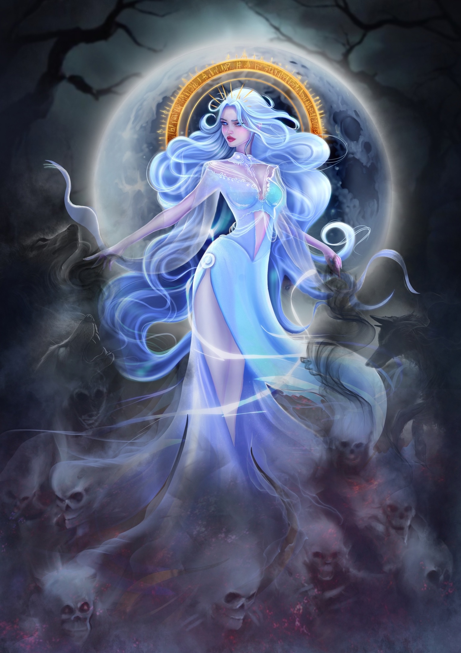 Её взгляд спокоен и холоден, но в нём скрыта бездна силы. Туман стелется у её ног, шепча забытые заклинания, а ночь склоняется перед её тихим величием.