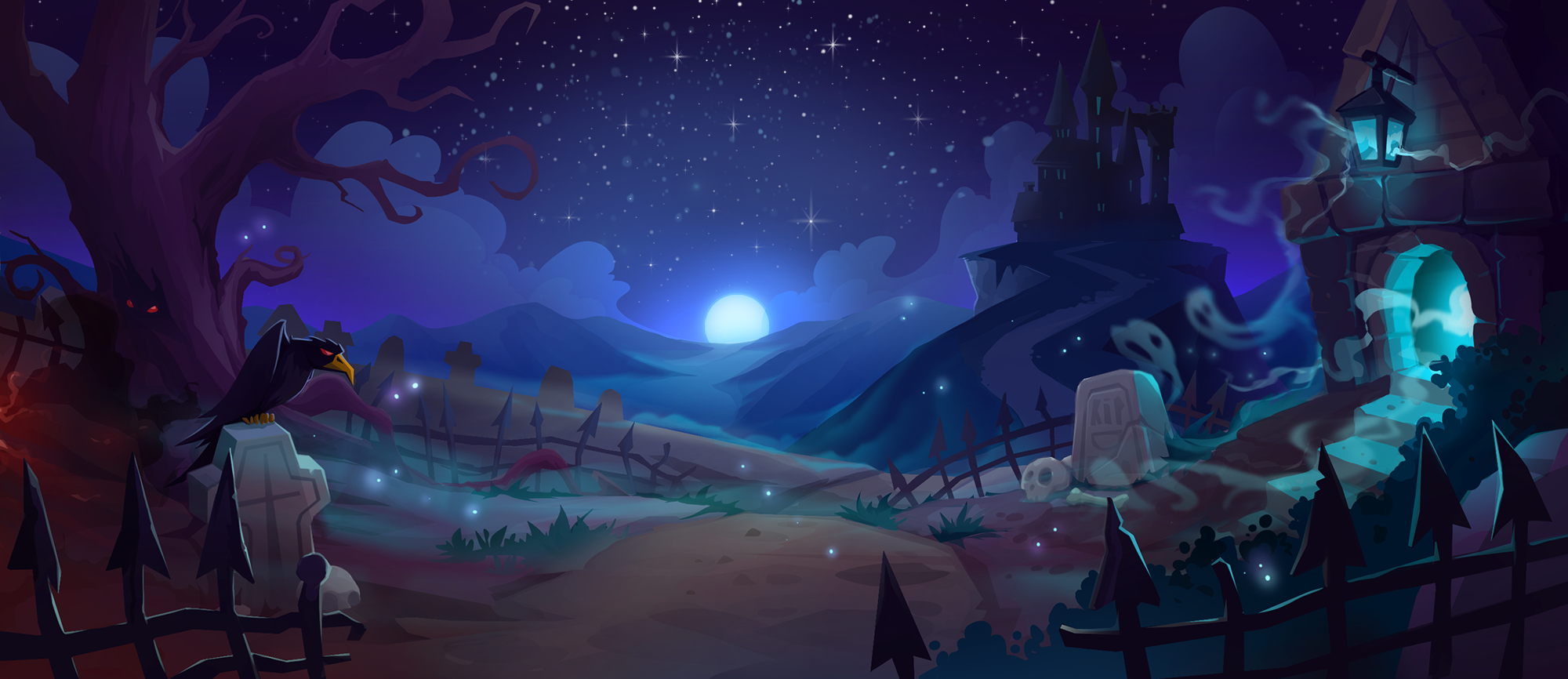 В лунном свете дорога вела к одинокому замку на вершине холма, а старое кладбище вздыхало туманом и шепотом забытых имён. На обломанном надгробье ворон сидел как часовой, в его глазах мерцал холодный огонь, а из каменного склепа лился голубой свет, словно кто-то позабыл закрыть дверь в другой мир.
