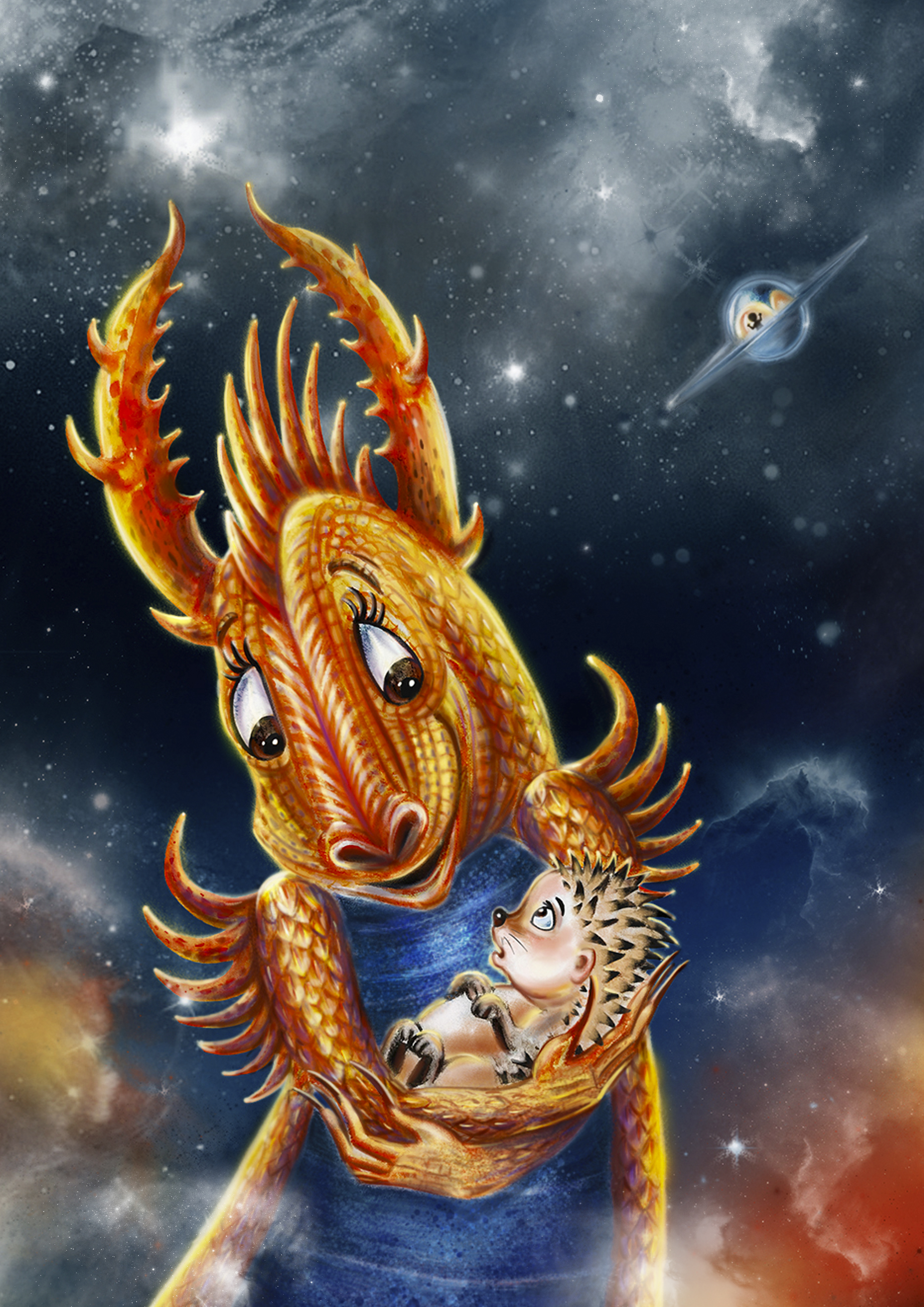 Иллюстрация к фантастической сказке "Бегущие по свету". Иарель - Хранителница Пепельных Зарниц держит на руках Тирви.