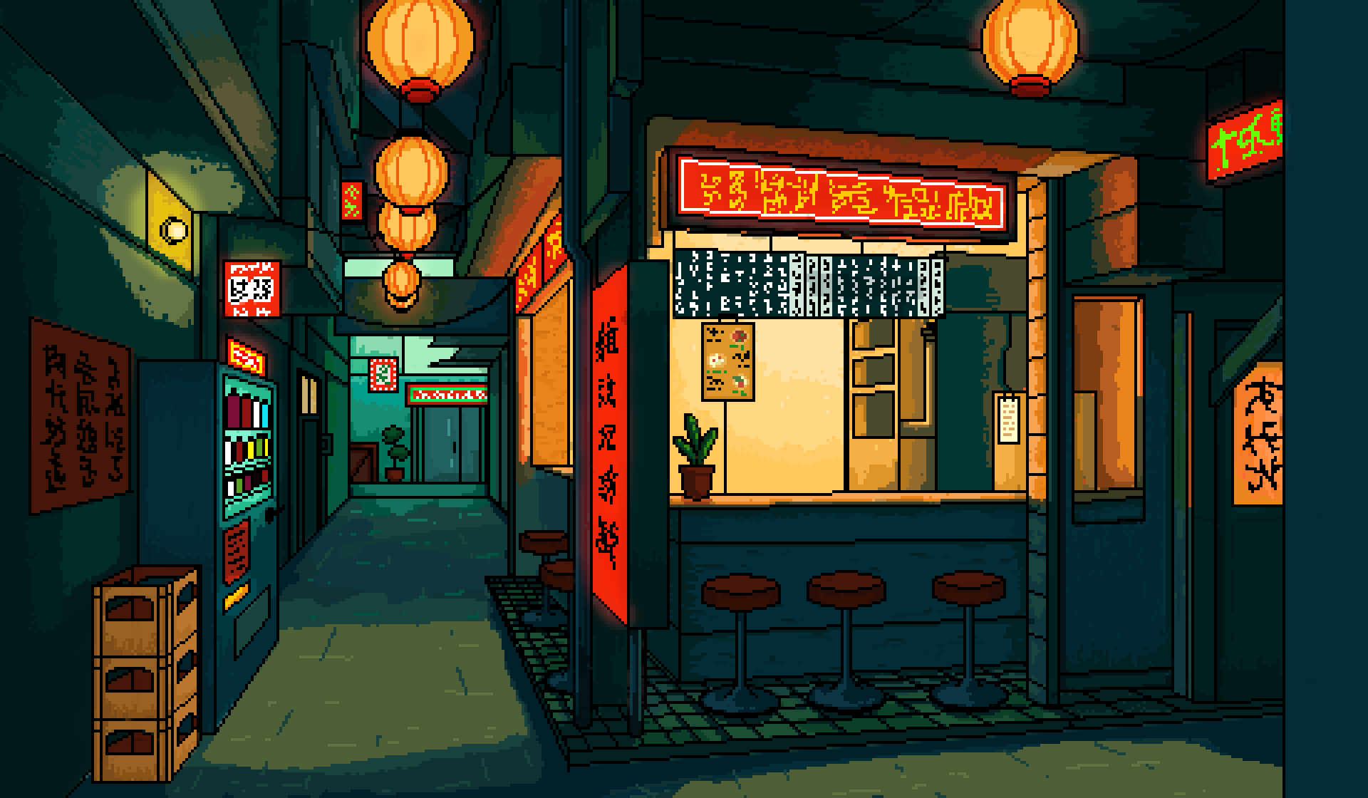 Пиксельная иллюстрация с акцентом на атмосферу вечернего азиатского города, свет и глубину пространства.