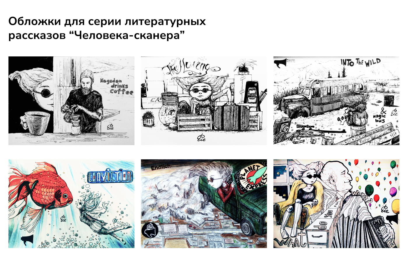 Заказчик попросил создать постоянного персонажа, от лица которого велось повествование, а также креативно изобразить философскую суть каждого рассказа. Все иллюстрации были размещены в качестве обложек к рассказам на сайте информационного агентства ИА MagadanMedia (филиал медиахолдинга PrimaMedia), в разделе “Блоги”