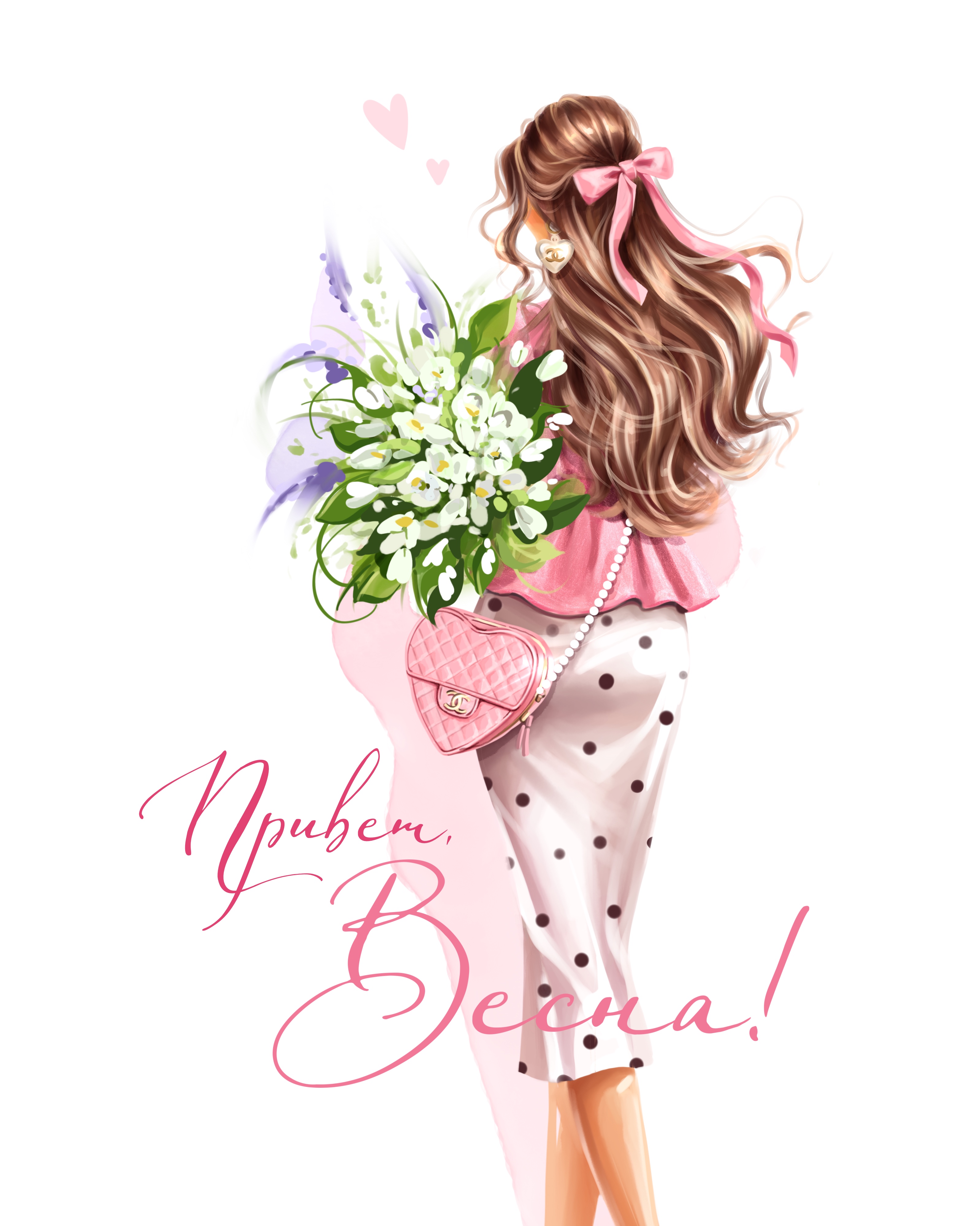 A beautiful girl with long hair, holding a bouquet of snowdrops