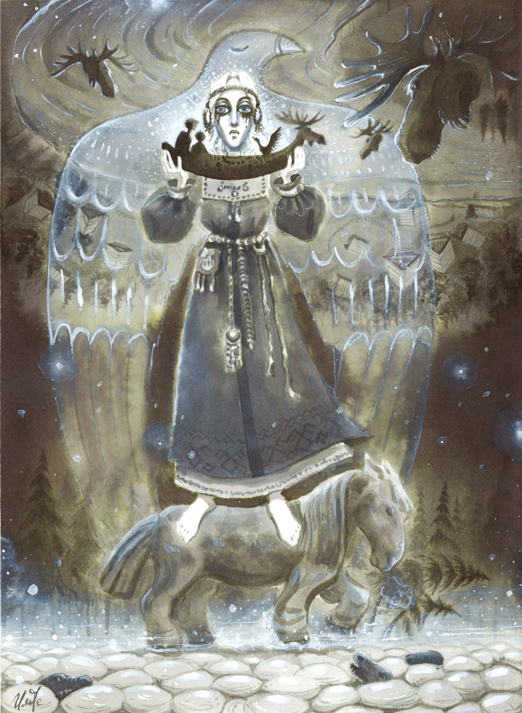 иллюстрация для книги "В лодке из медвежьих снов" Оксаны Заугольной, издательство Ламинария, 2026г. Вариант до предпечатной обработки(в печати чб)