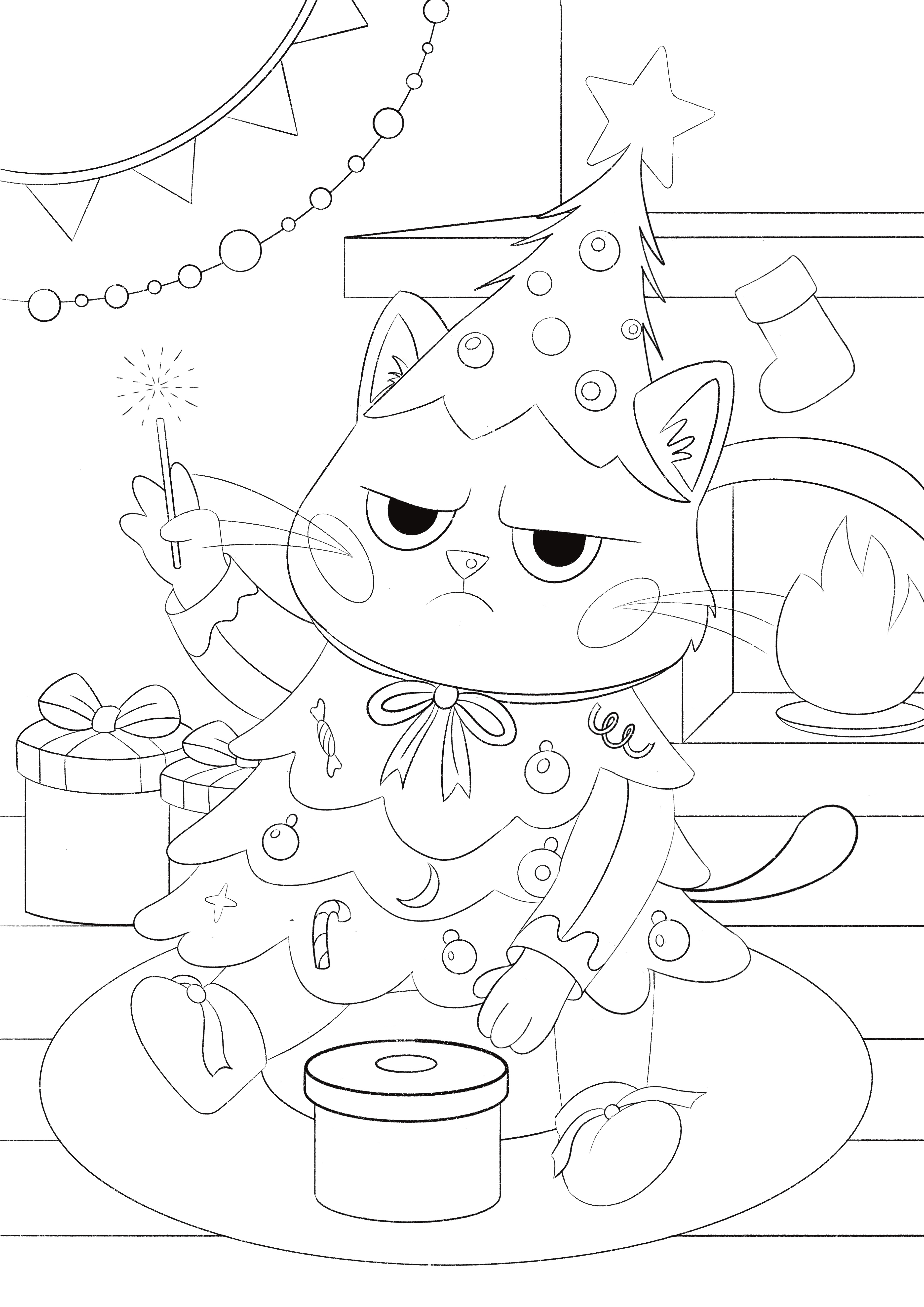 Скетч недовольный котик для новогодней раскраски