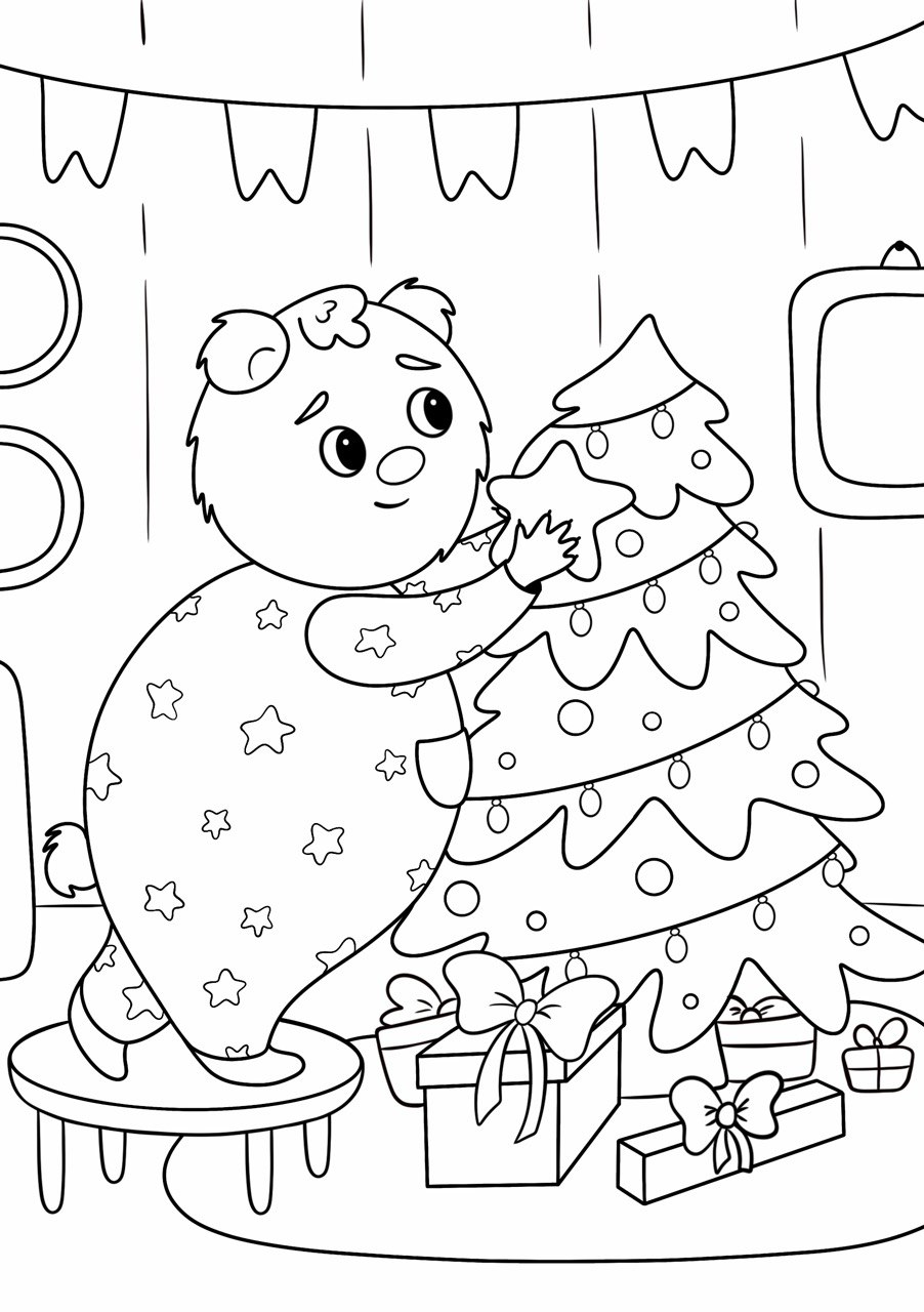 Coloring page "Teddy Bear Decorating the Christmas Tree"
