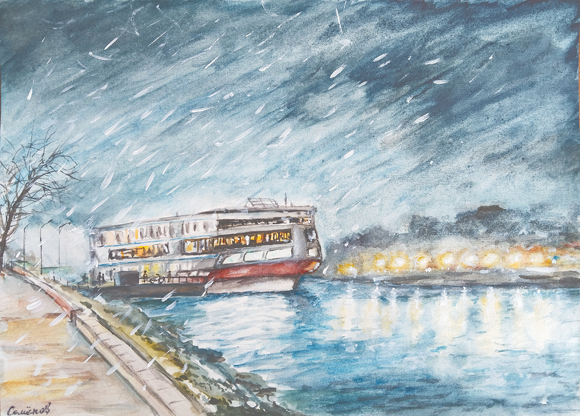 "Мустай Карим" на причале у речного вокзала в Твери. Вечер, осень, снег с дождем.