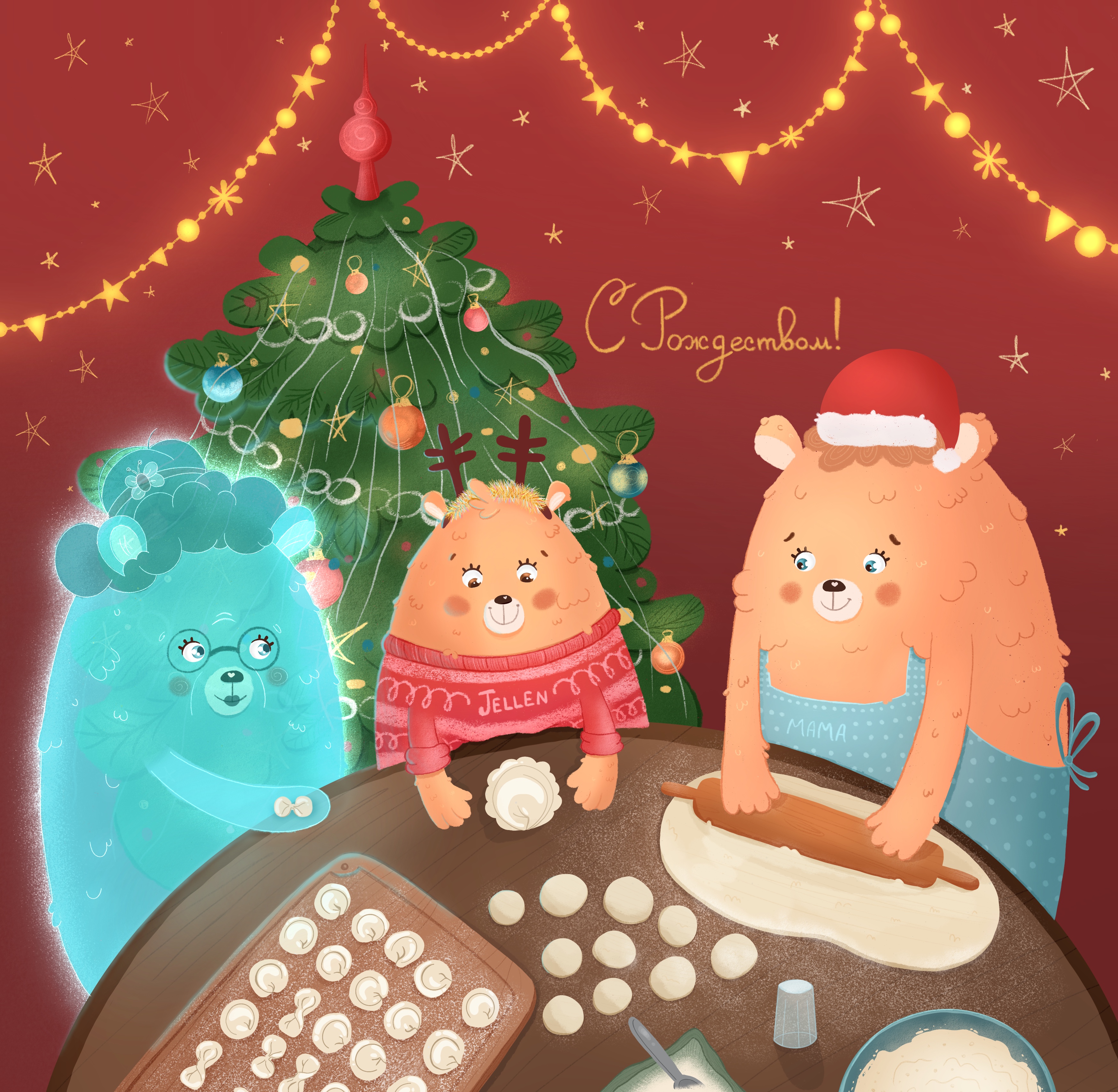 A Christmas card with a little bear, her mother, and her grandmother, who are no longer with us