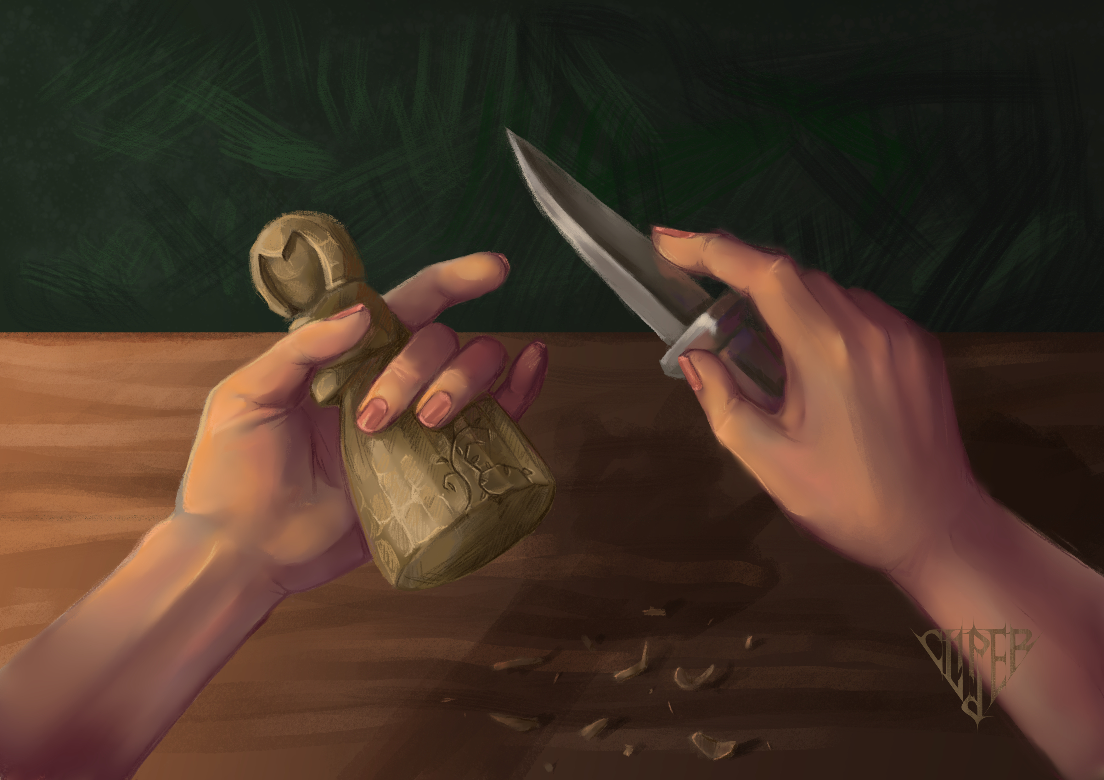 "Аккуратные золотистые завитки падали на столешницу, время от времени улетая на землю. Резка по дереву ощущалась как медитация, но в отличие от нее приносила доход и радость окружающим. Мариону нравилось осознавать, что всего через пару часов усердной работы неприметное поленце превратится в очередную игрушку. Сказочные существа всегда были ему ближе этого серого мира."