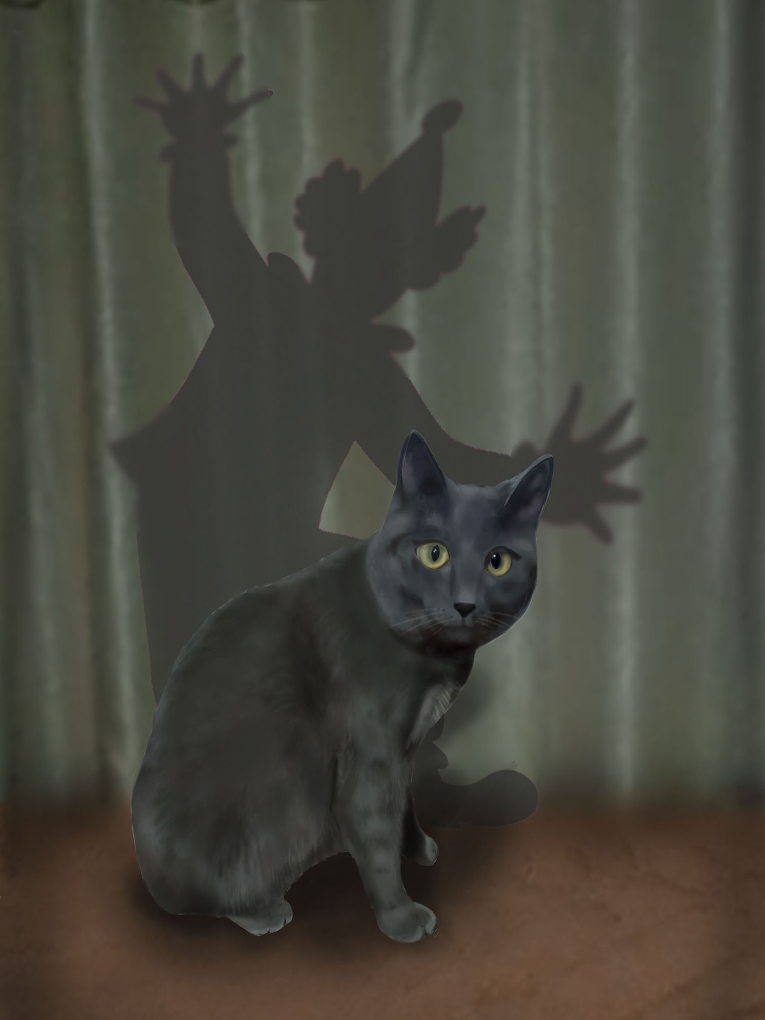 A piece from the "Shadows" series. It’s a story about the wild side that hides within even the calmest-looking cat. This grey acrobat refuses to be tamed, while his shadow lives a life of its own, putting on a real circus show. A play on dynamic energy, contrast, and the hidden "clown" inside us all.