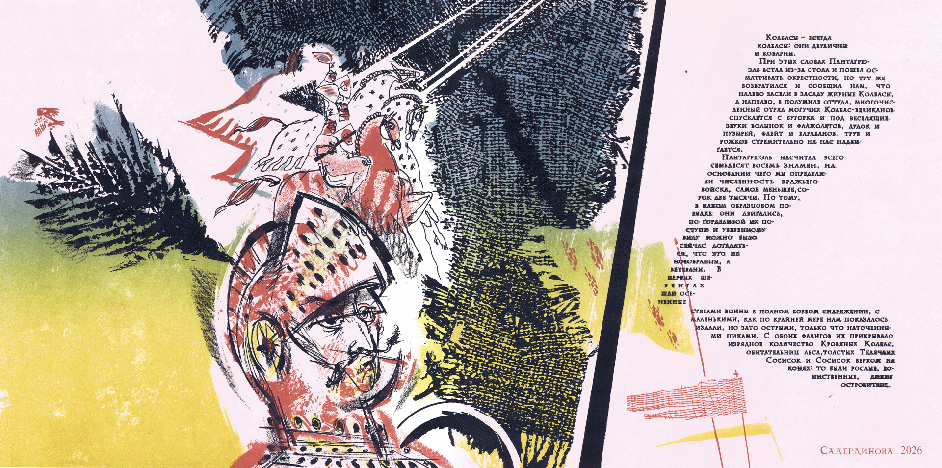 Illustration-fold for the novel by F. Rabelais "Gargantua and Pantagruel". 2026. Color lithography. 29.5x59 cm.